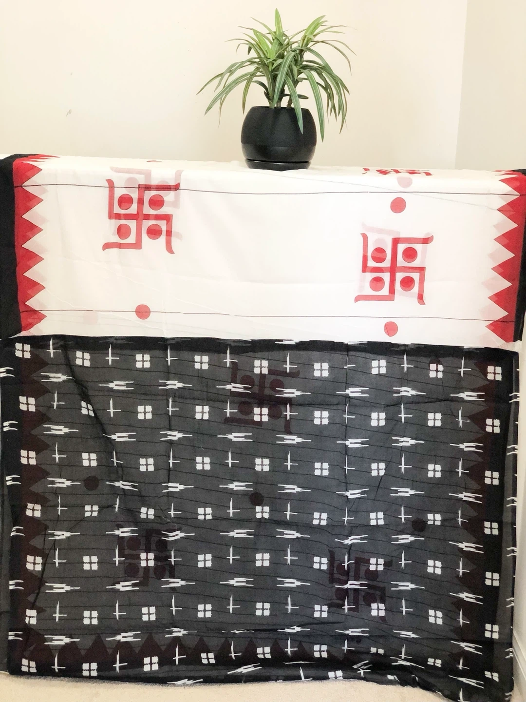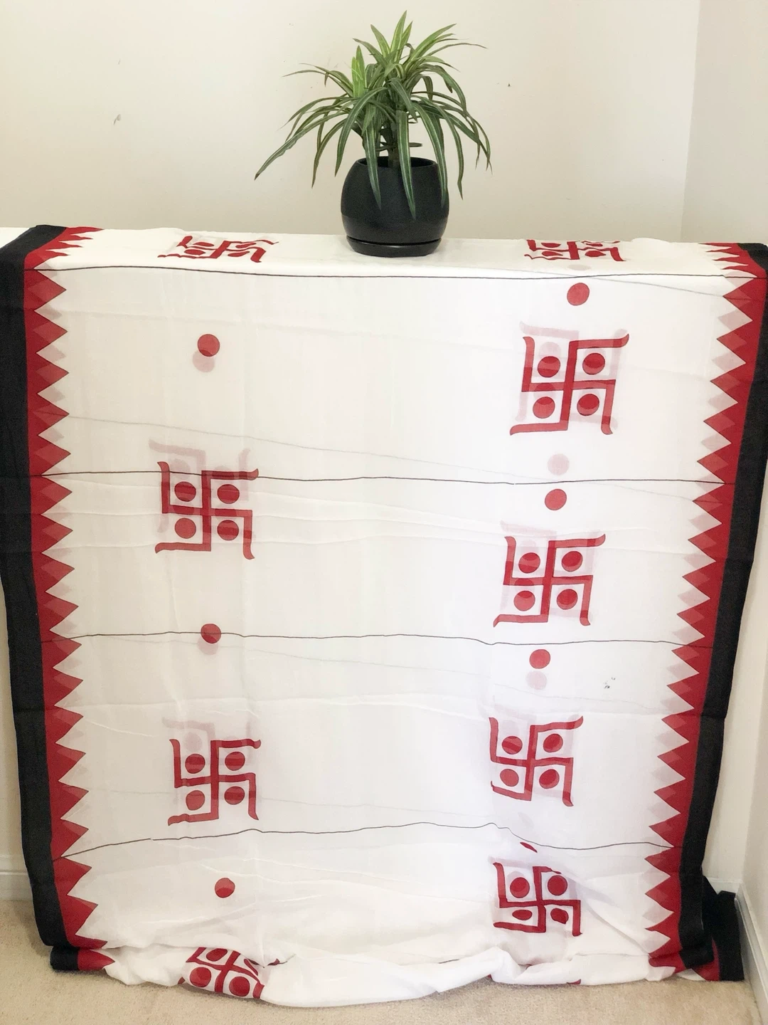 This is a white cotton mulmul saree featuring a red swastik motif and a decorative red and black border. It includes the print blouse. It's a lightweight fabric, perfect for cultural events.