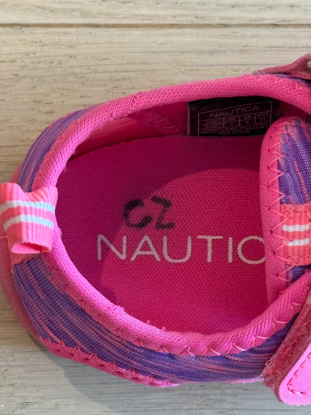 These adorable Nautica water shoes are perfect for your little one! They're in great condition and ready for some fun in the sun. The shoes feature a pink and purple design with a velcro strap for easy on and off. Initial marked inside if you don’t mind. Size 7.