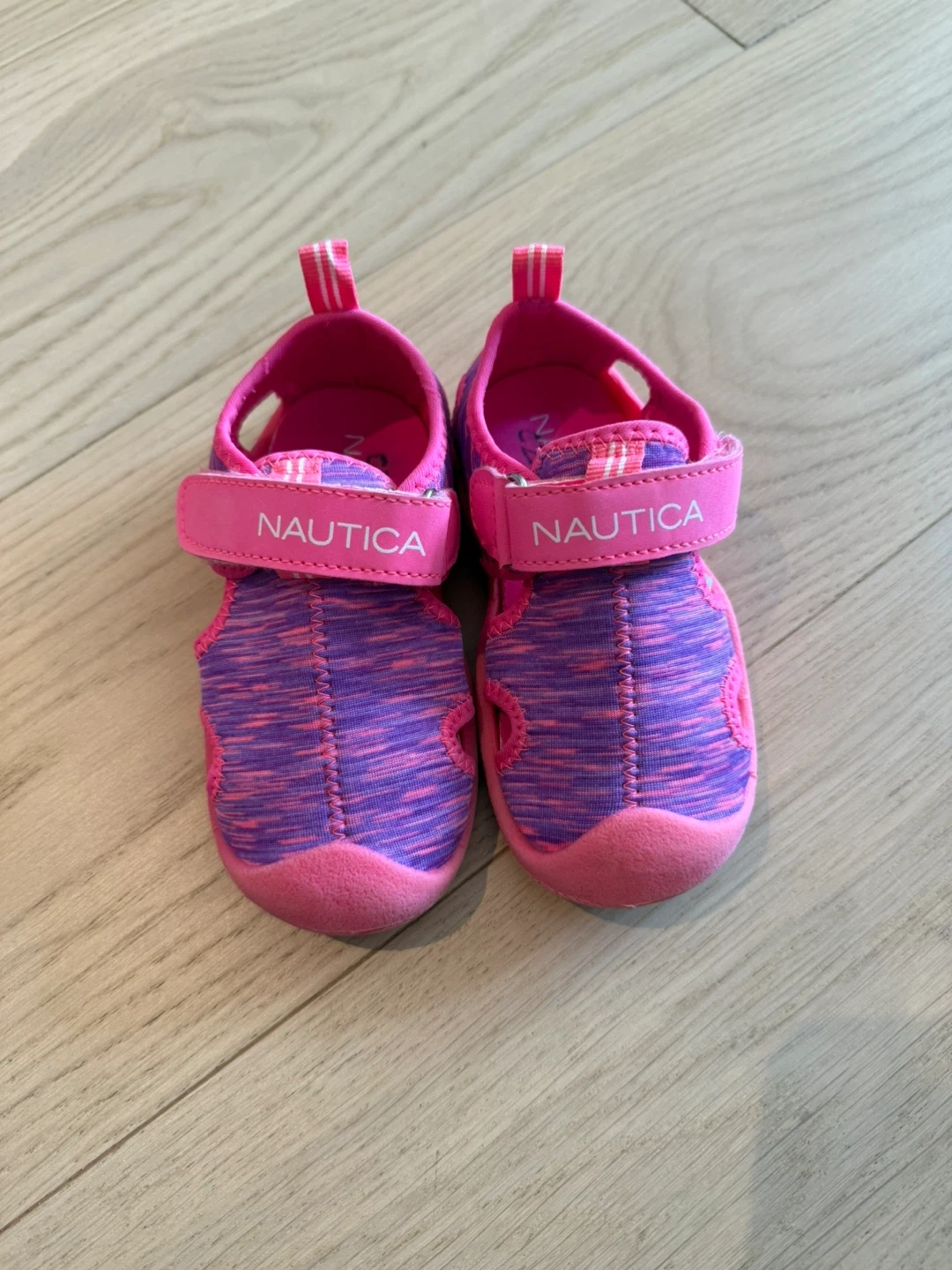 These adorable Nautica water shoes are perfect for your little one! They're in great condition and ready for some fun in the sun. The shoes feature a pink and purple design with a velcro strap for easy on and off. Initial marked inside if you don’t mind. Size 7.