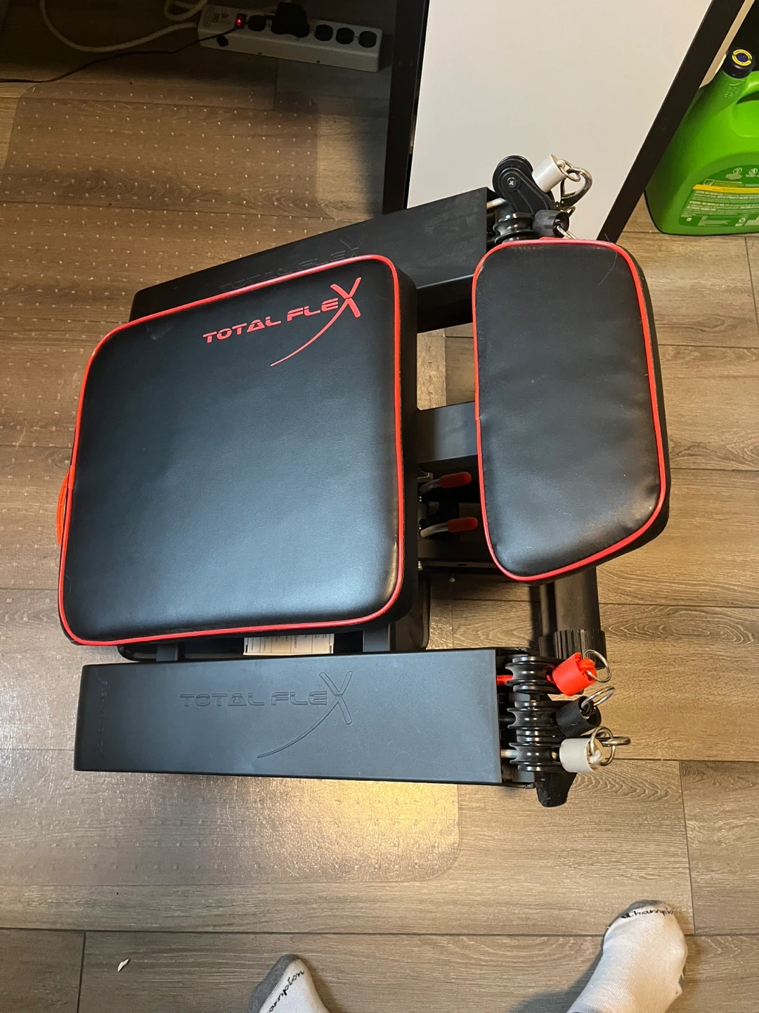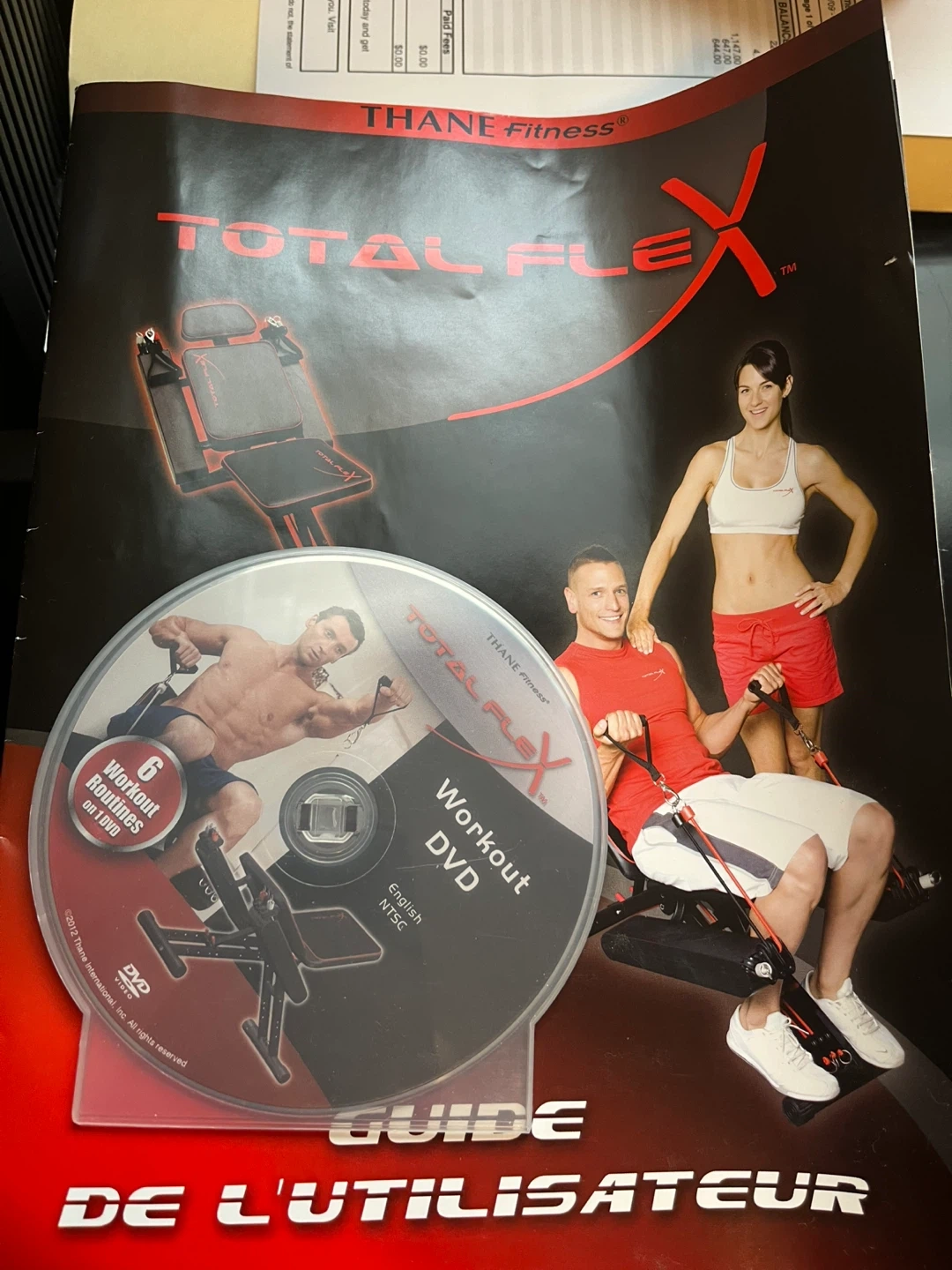 This Total Flex by Thane Fitness is a home gym machine designed for a full body workout. It comes with a workout DVD and user guide. The machine is black with red accents. It's suitable for a variety of exercises targeting different muscle groups.