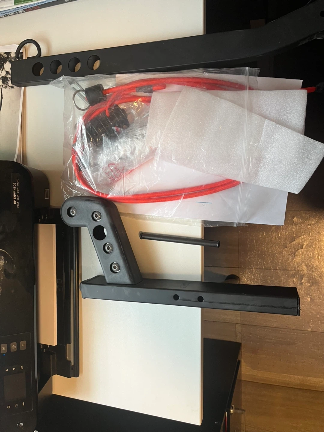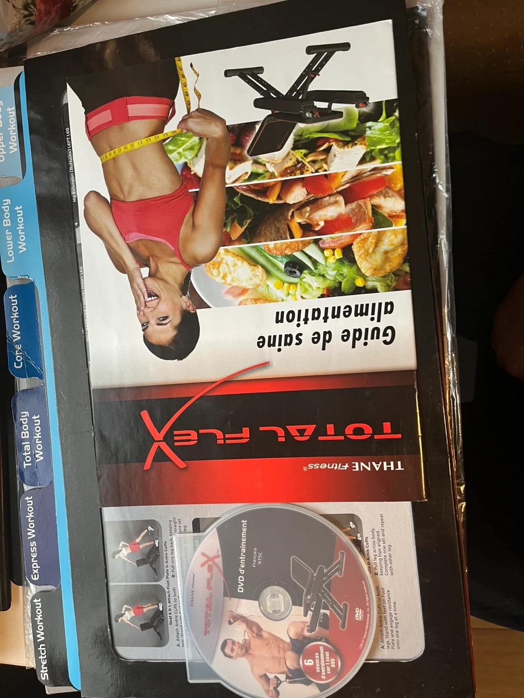This Total Flex by Thane Fitness is a home gym machine designed for a full body workout. It comes with a workout DVD and user guide. The machine is black with red accents. It's suitable for a variety of exercises targeting different muscle groups.