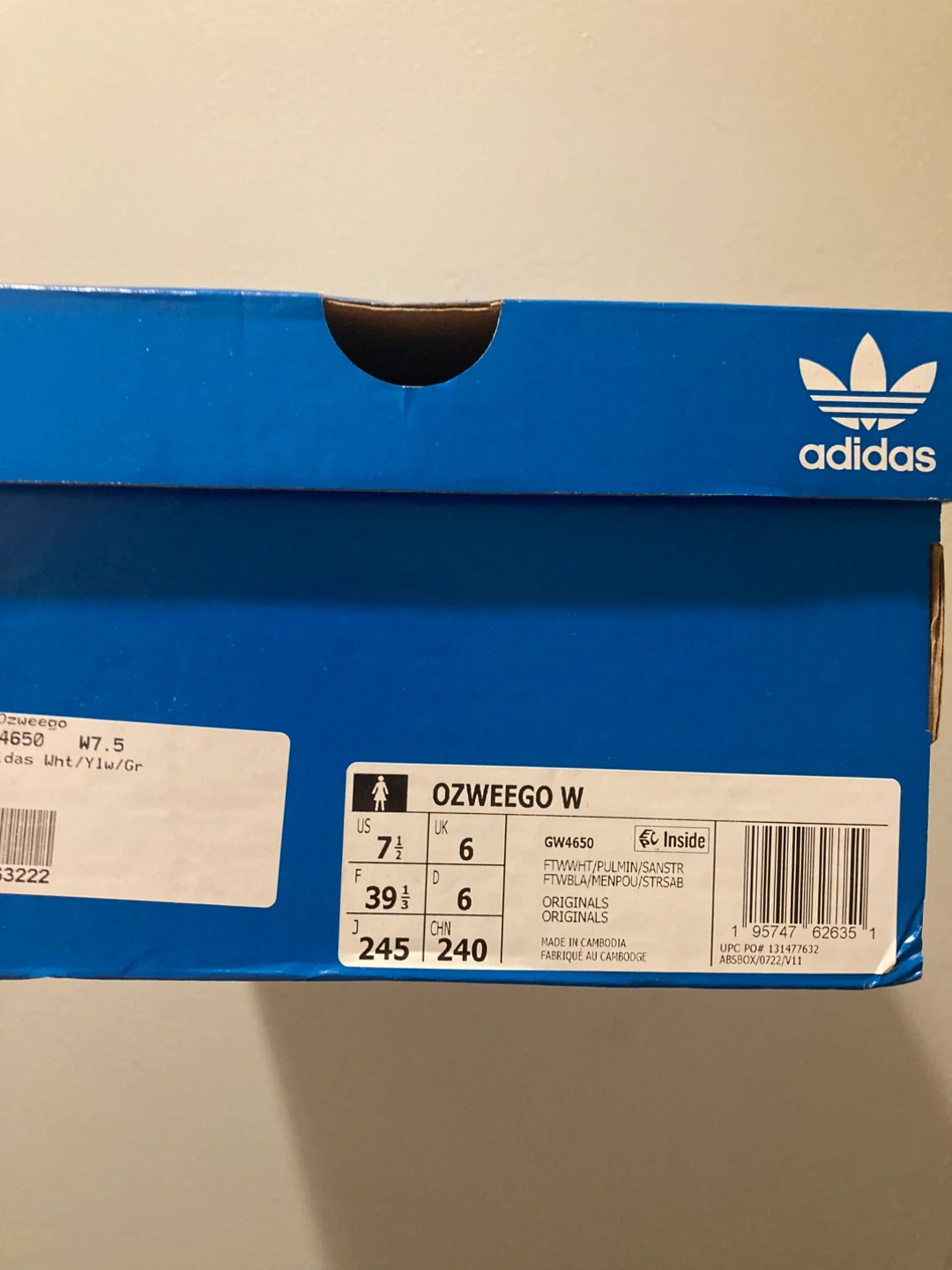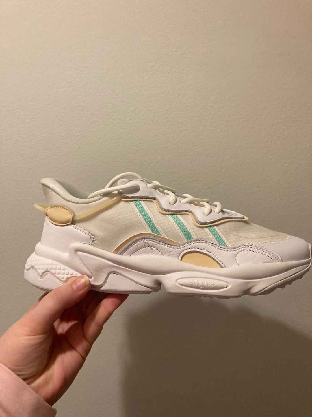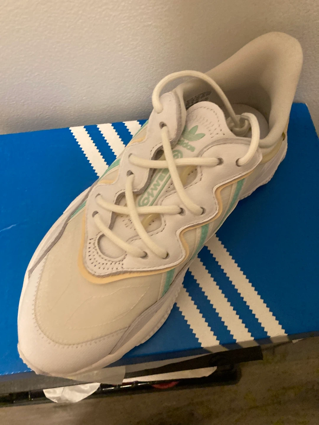 Selling a pair of Adidas Ozweego W women's sneakers in size 7.5 US. They come with the original box! The colour is white/yellow/green.