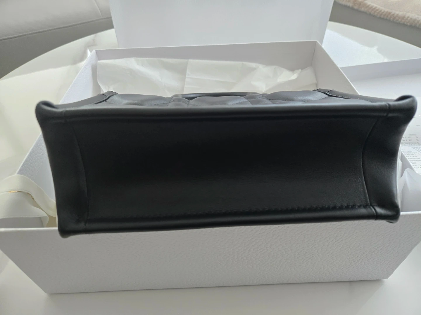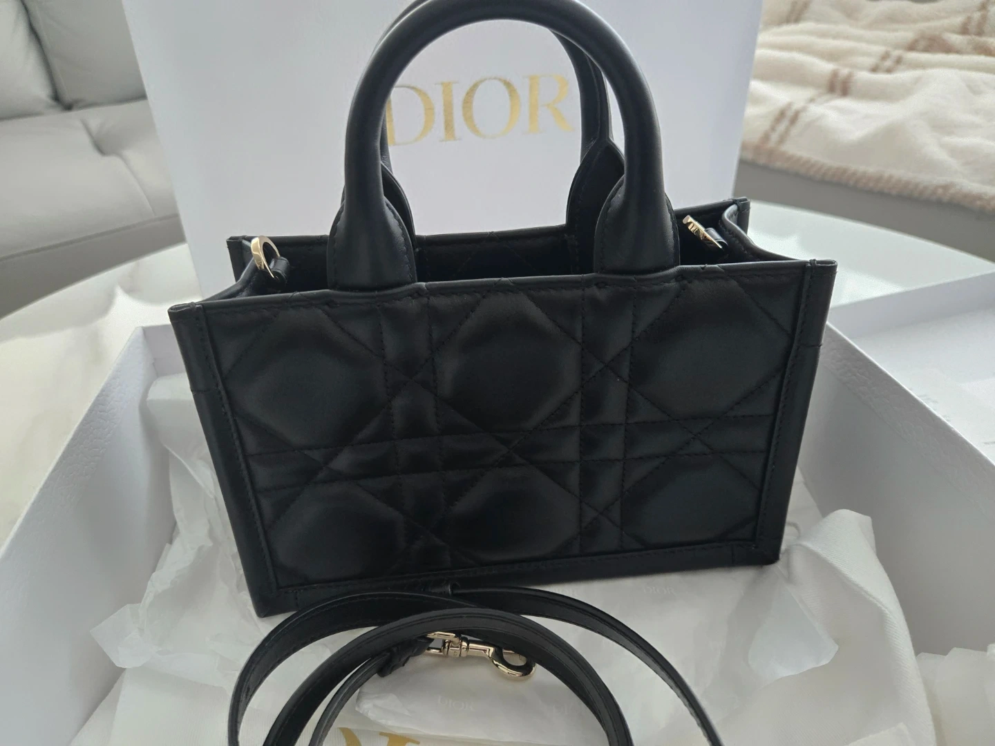 This is a Dior mini tote bag in black leather with quilted stitching. It's a structured top-handle bag with a detachable shoulder strap and gold-tone hardware. The bag comes with its original box, dust bag, and shopping bag.