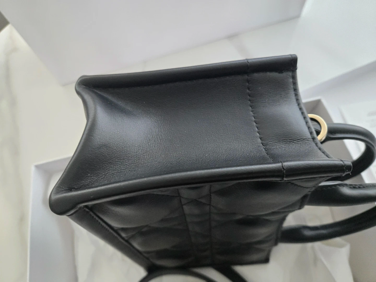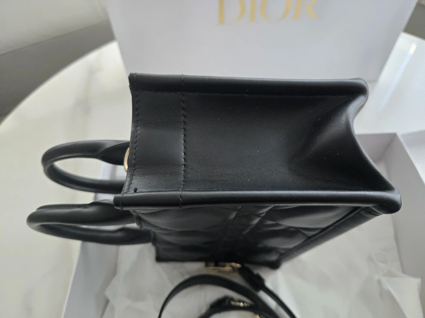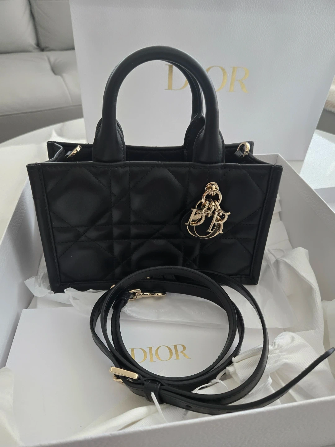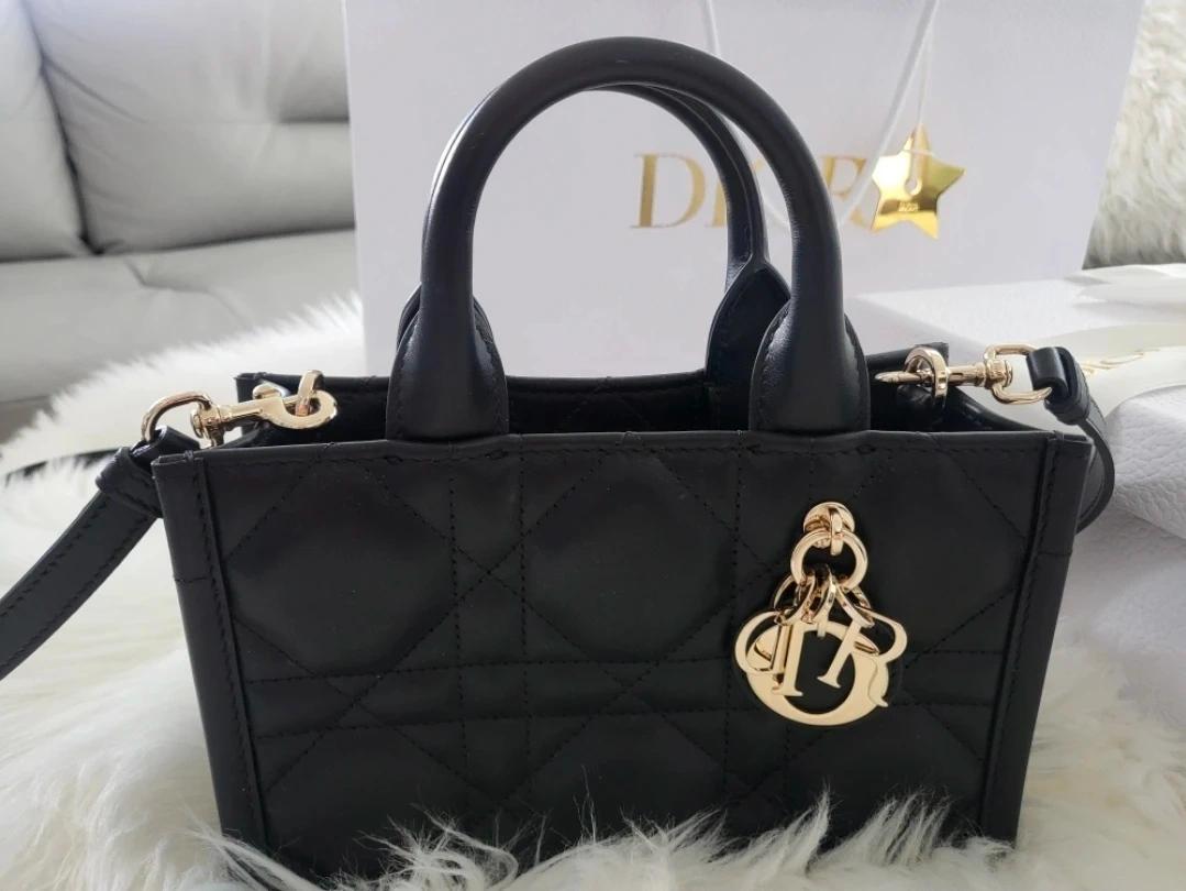 This is a Dior mini tote bag in black leather with quilted stitching. It's a structured top-handle bag with a detachable shoulder strap and gold-tone hardware. The bag comes with its original box, dust bag, and shopping bag.