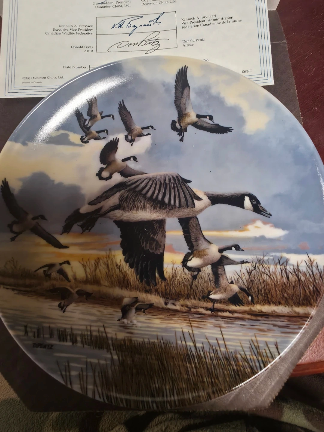 This is the first issue in the "Upon the Wind" collection, "The Landing" by artist Donald Pentz. It's made of fine china, plate number 1092-C. This limited edition plate was produced by Dominion China Ltd. in 1986. It comes with a certificate of authenticity from the Canadian Wildlife Federation.