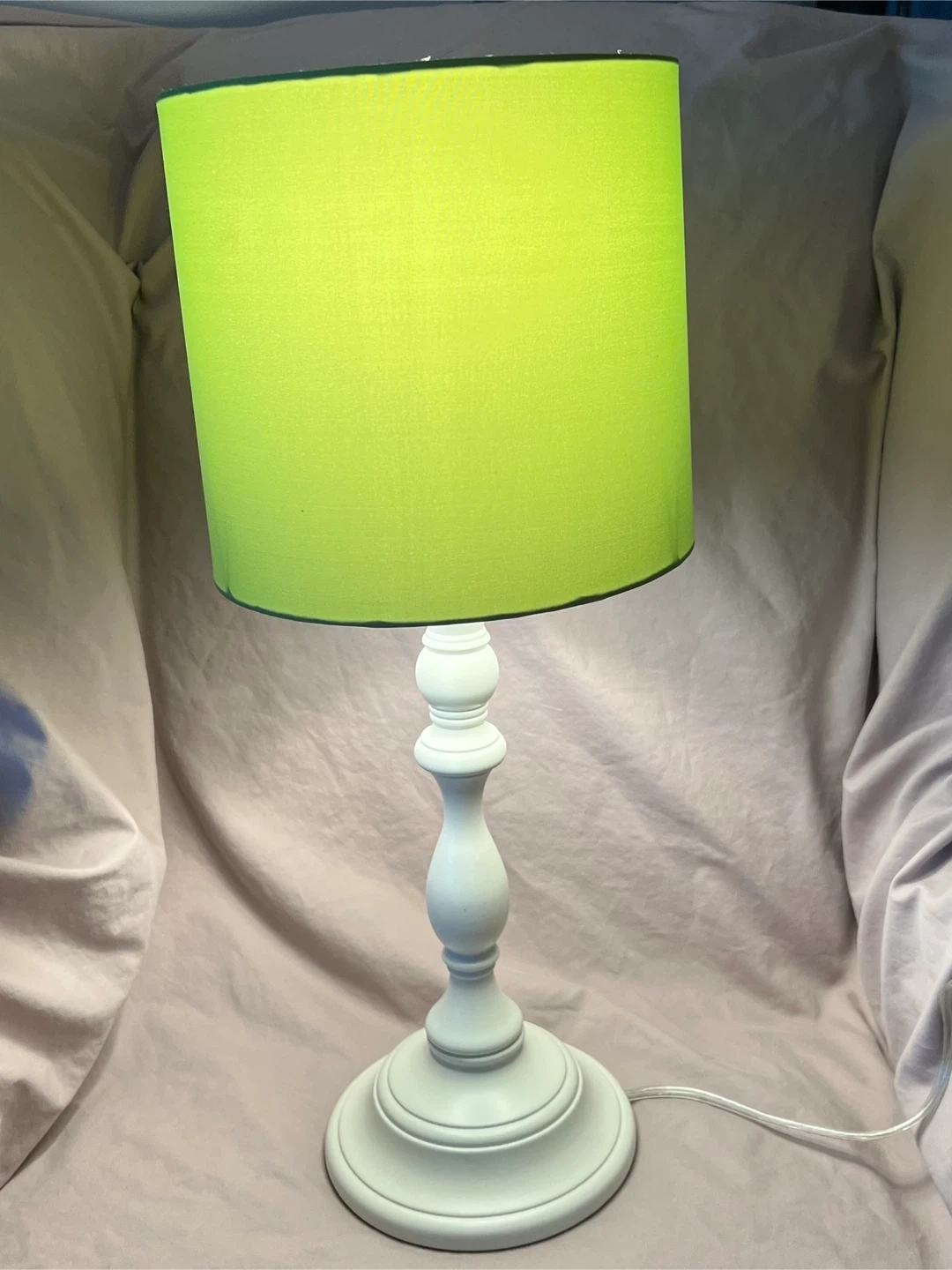 White table lamp with a bright green lampshade. It's a Pottery Barn Kids Payton model. This lamp is great for a child's bedroom or playroom!