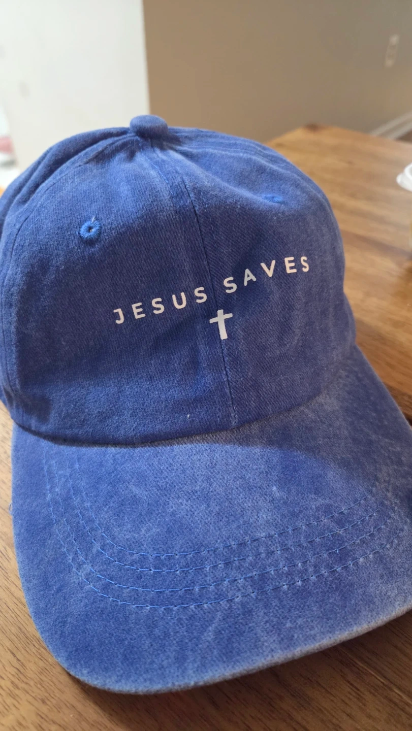 This is a cool blue Cap with Jesus Saves logo. Can be worn by male or female. It's brand new and I have it as extra. Denim-like material, and has an adjustable strap in back with a metal buckle. Great for everyday wear. Please don't ask for a lower price.