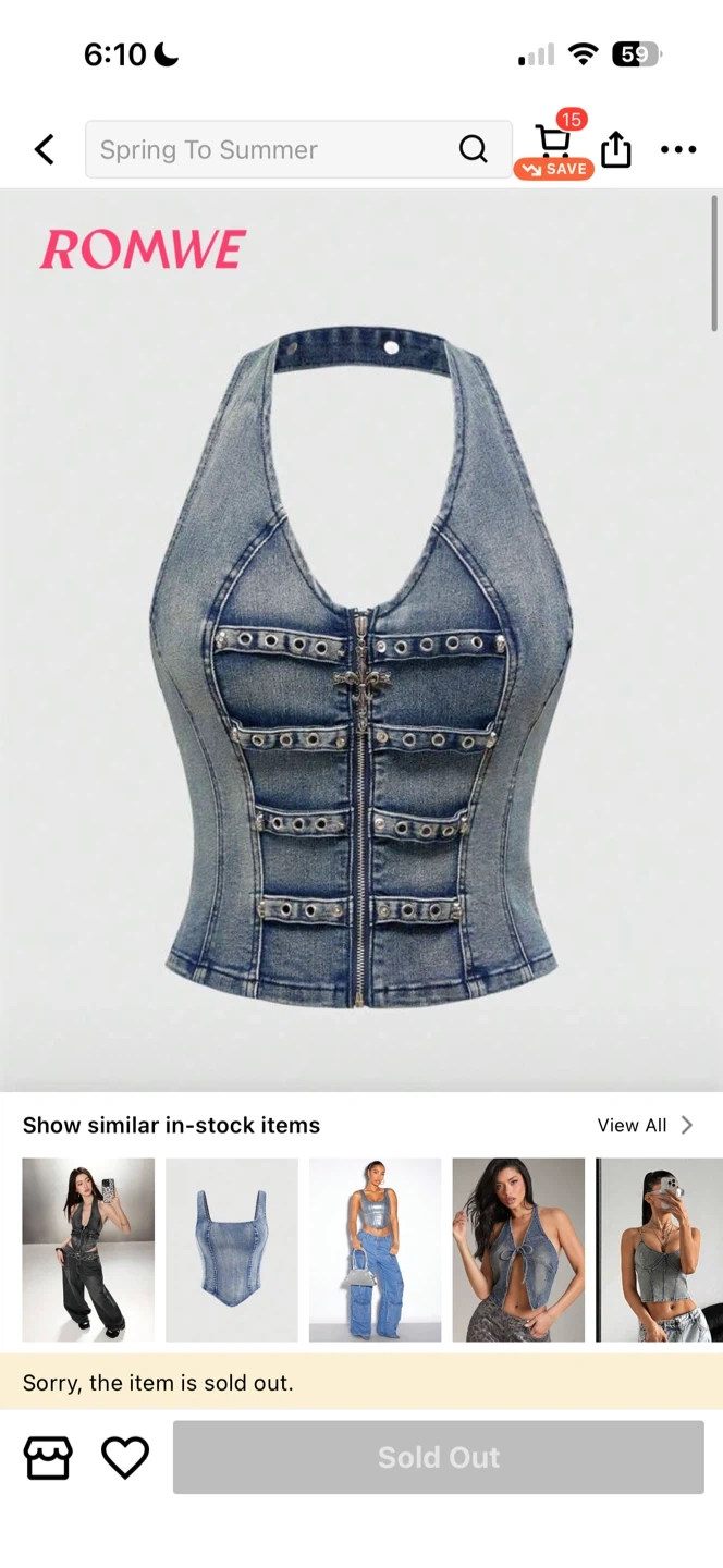 This is a ROMWE halter top made of denim. It features a zipper front and decorative studs. It's designed for a fitted look. Good for a night out!