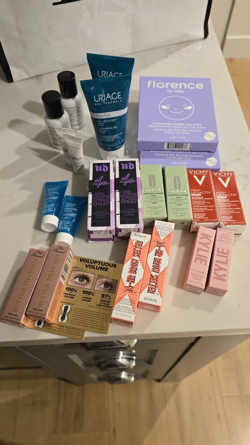 Selling a mixed lot of beauty products including items from Too Faced Better Than Sex Mascara, Urban Decay All Nighter Setting Spray, Florence by Mills eye gels, Clinique Moisture Surge, Vichy LiftActiv, Benefit 24-HR Brow Setter, and Kylie Cosmetics