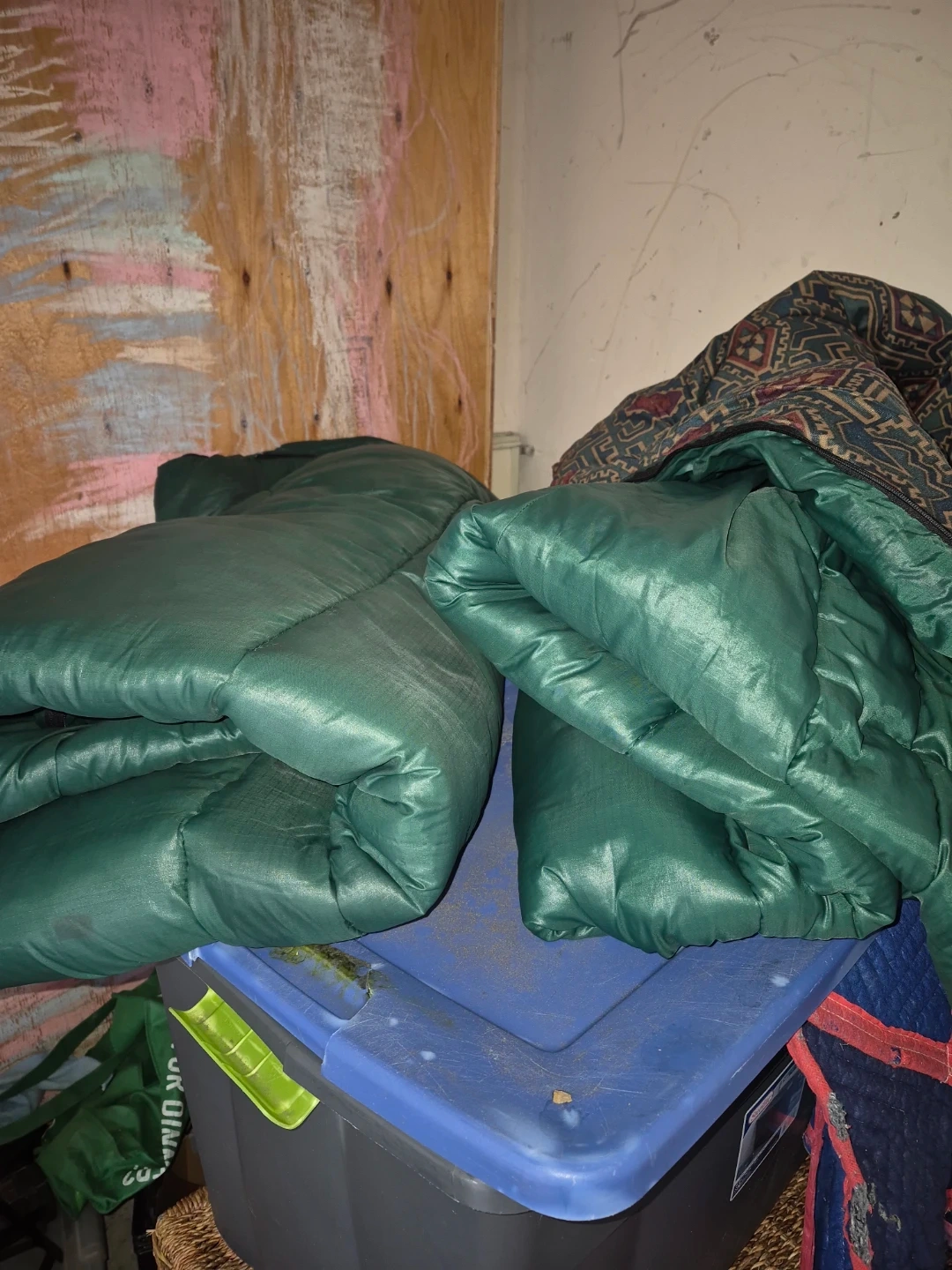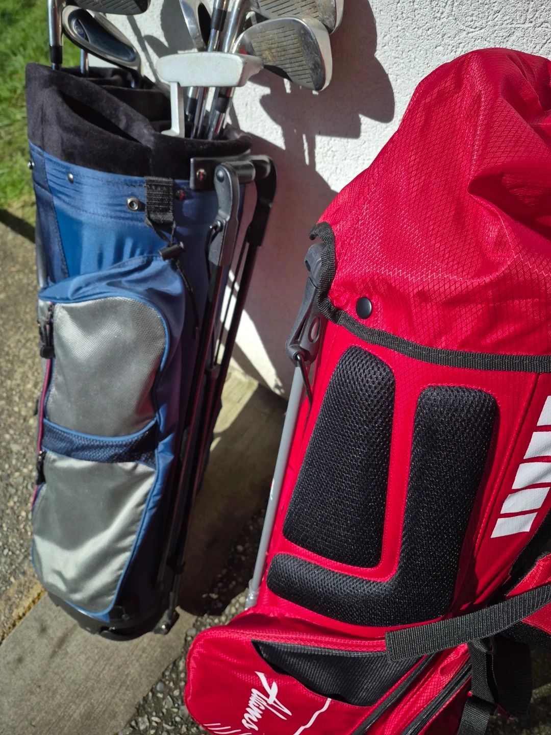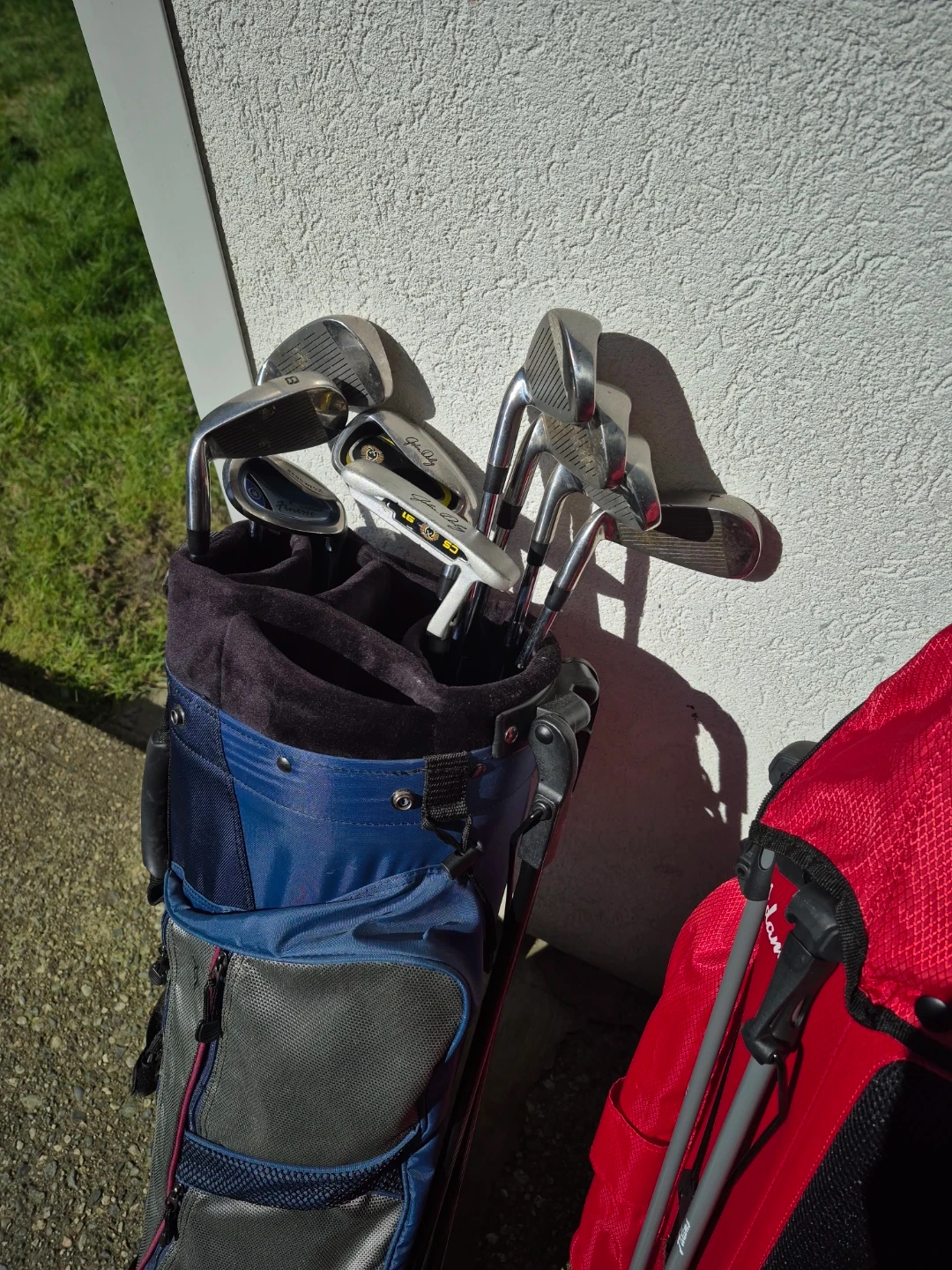 This set includes golf clubs and a blue and grey golf bag. A second red golf bag is also included. Includes a green sleeping bag with a patterned outer shell.