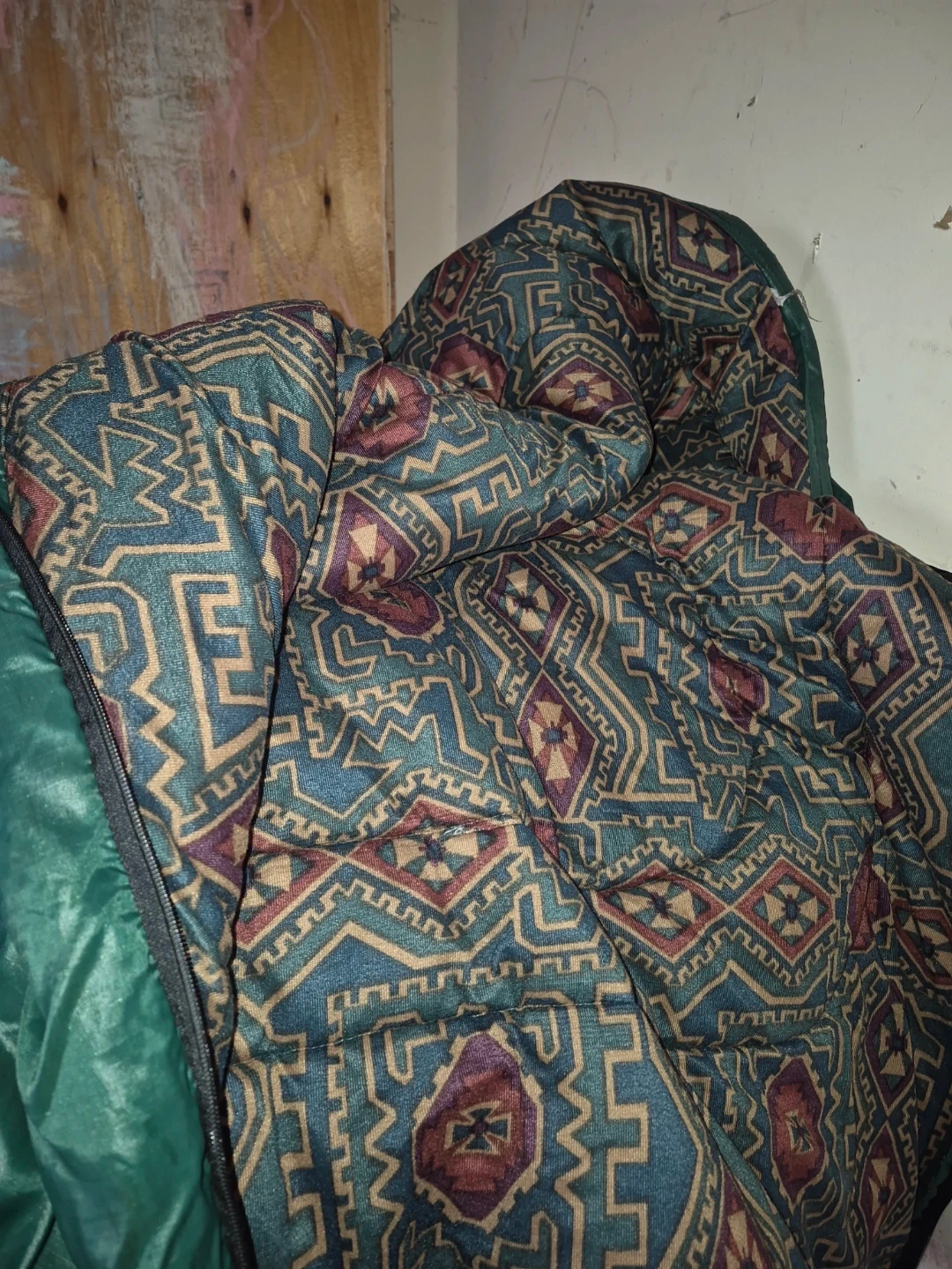 This set includes golf clubs and a blue and grey golf bag. A second red golf bag is also included. Includes a green sleeping bag with a patterned outer shell.