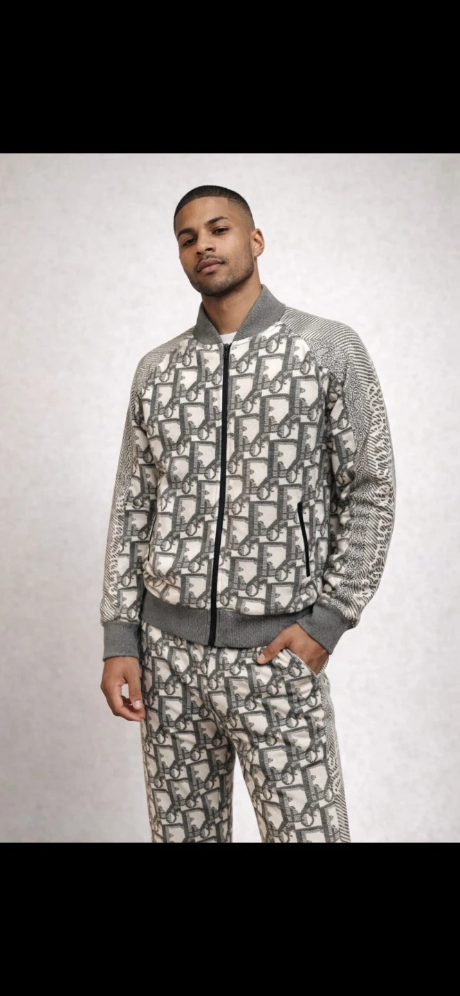 This Christian Dior bomber jacket features the iconic monogram print. It's made from a knit material with a zip-up front and ribbed collar, cuffs, and hem. Size M.