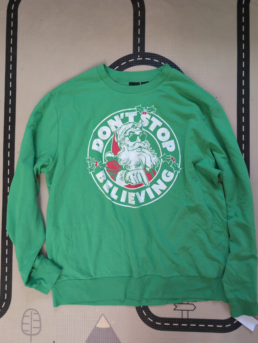 This green crewneck sweater features a fun "Don't Stop Believing" graphic with a cool Santa Claus design. It's a festive and comfortable piece for the holiday season! Cotton blend material.