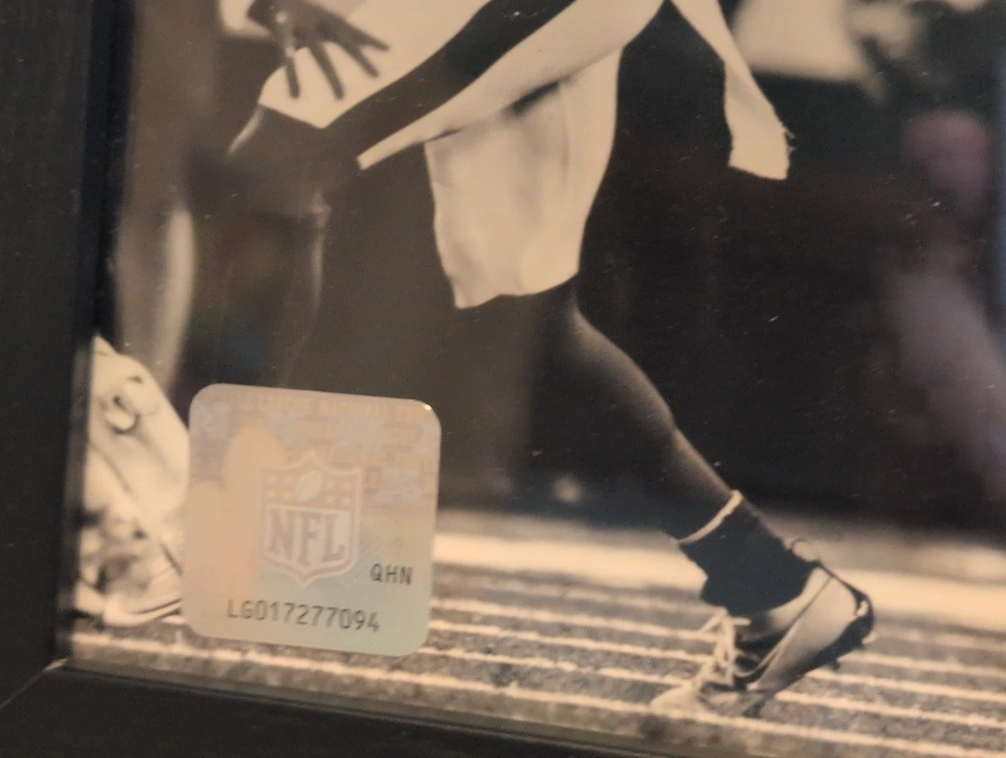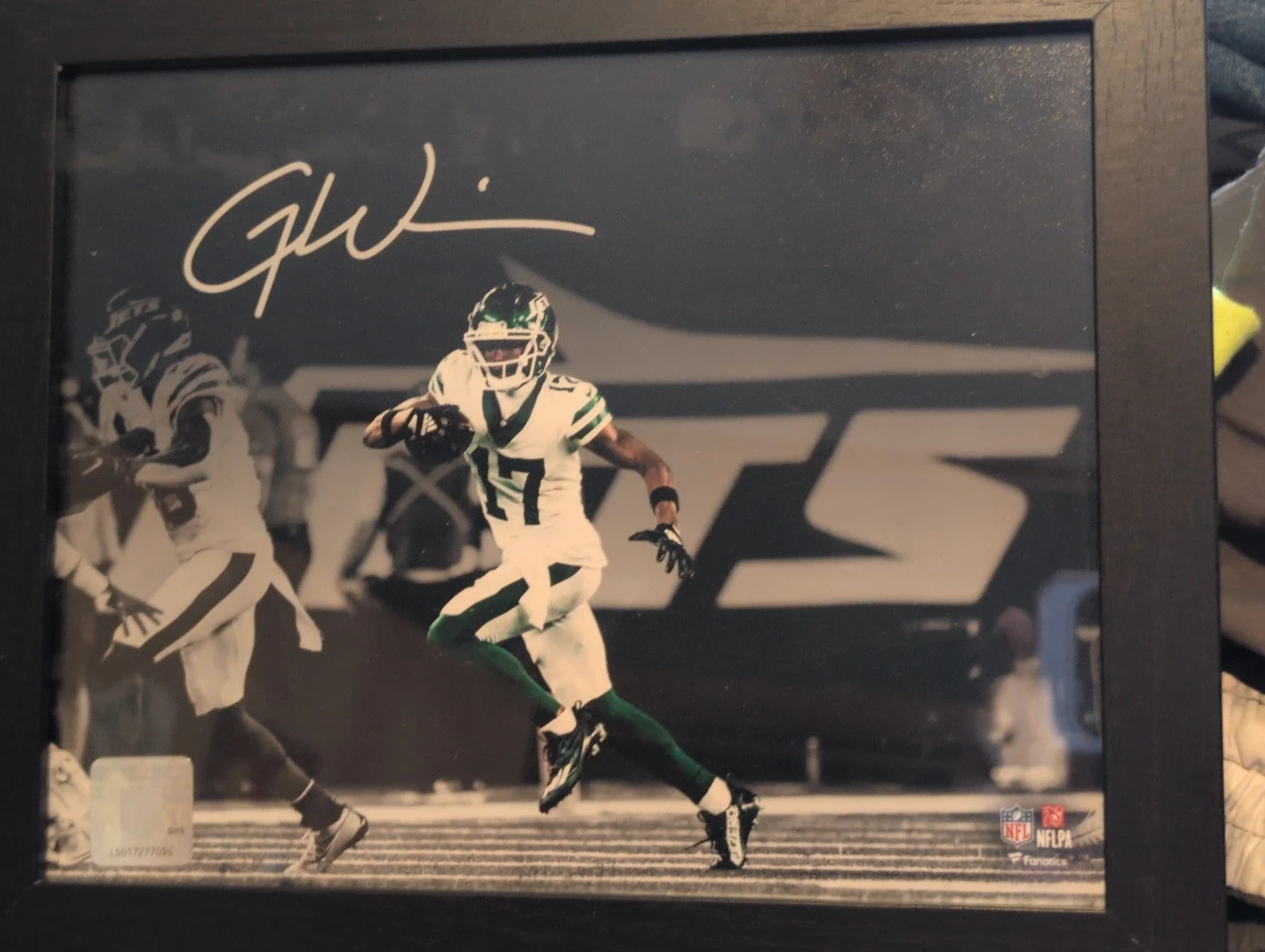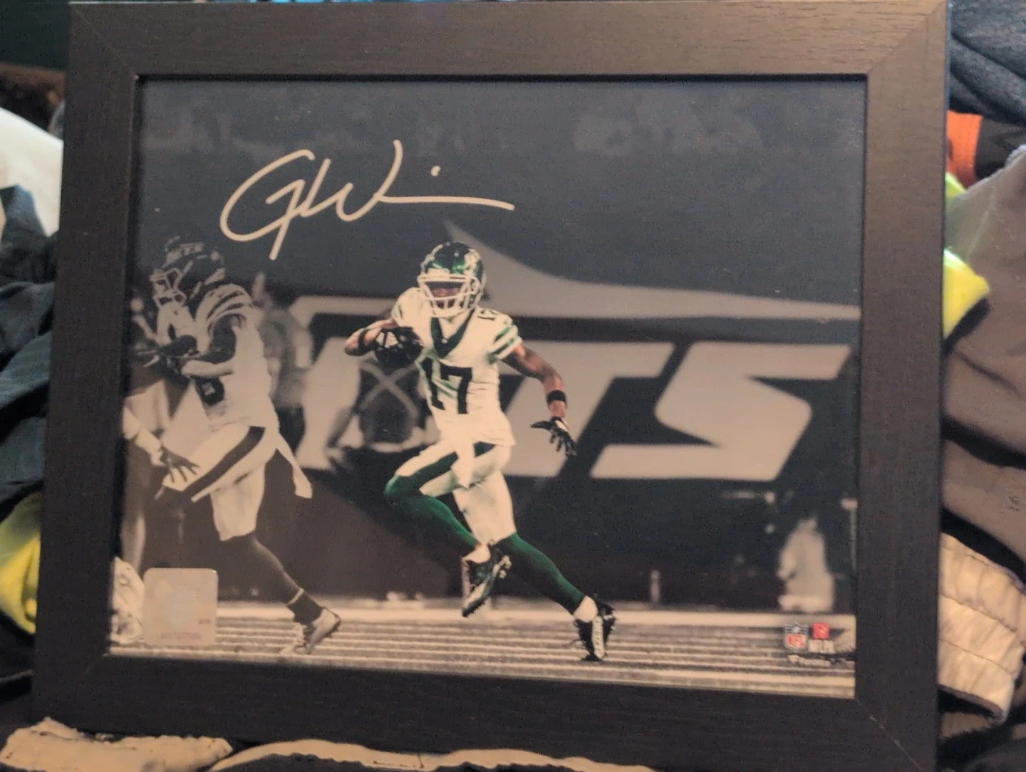 Framed photo featuring a New York Jets player in action. Includes an autograph and an NFL authentication sticker. The frame has a black finish.