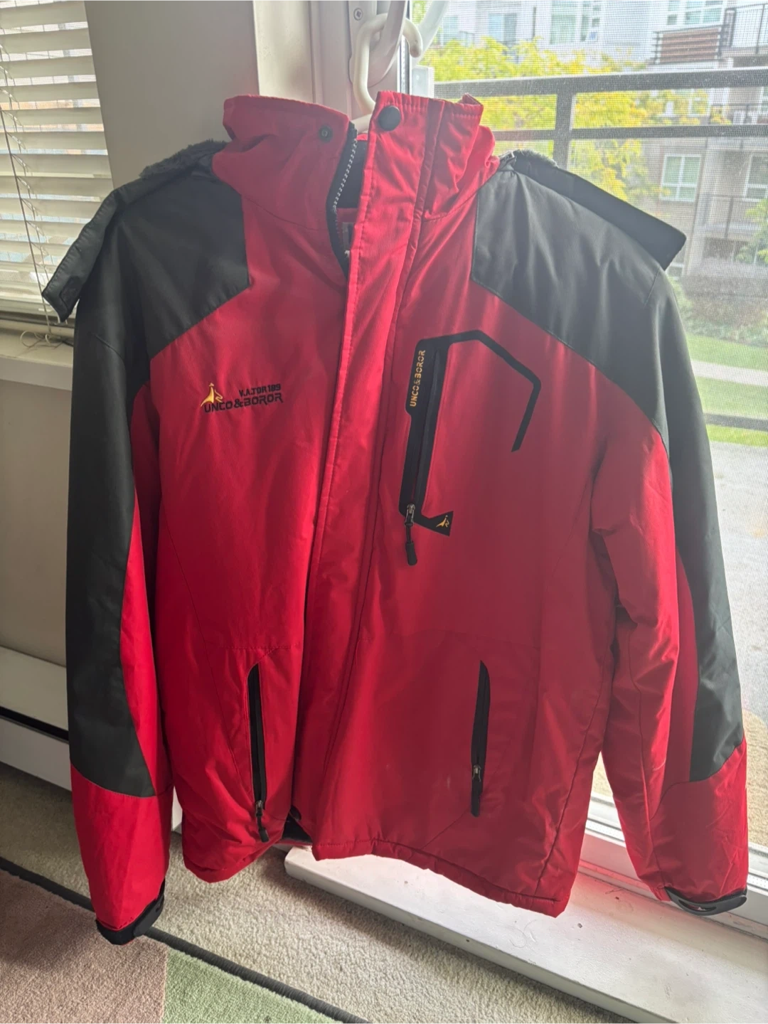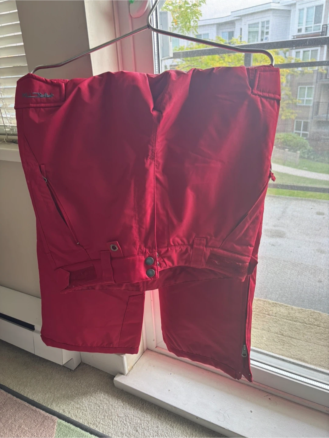 Selling a ski jacket and pants set in red and black. The jacket features a logo on the front. Great for hitting the slopes this winter!
