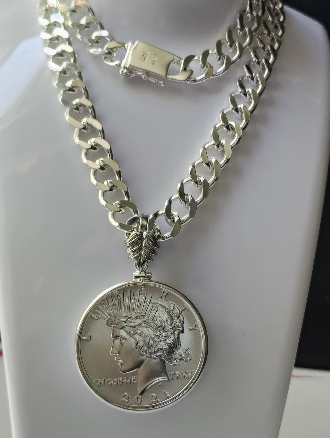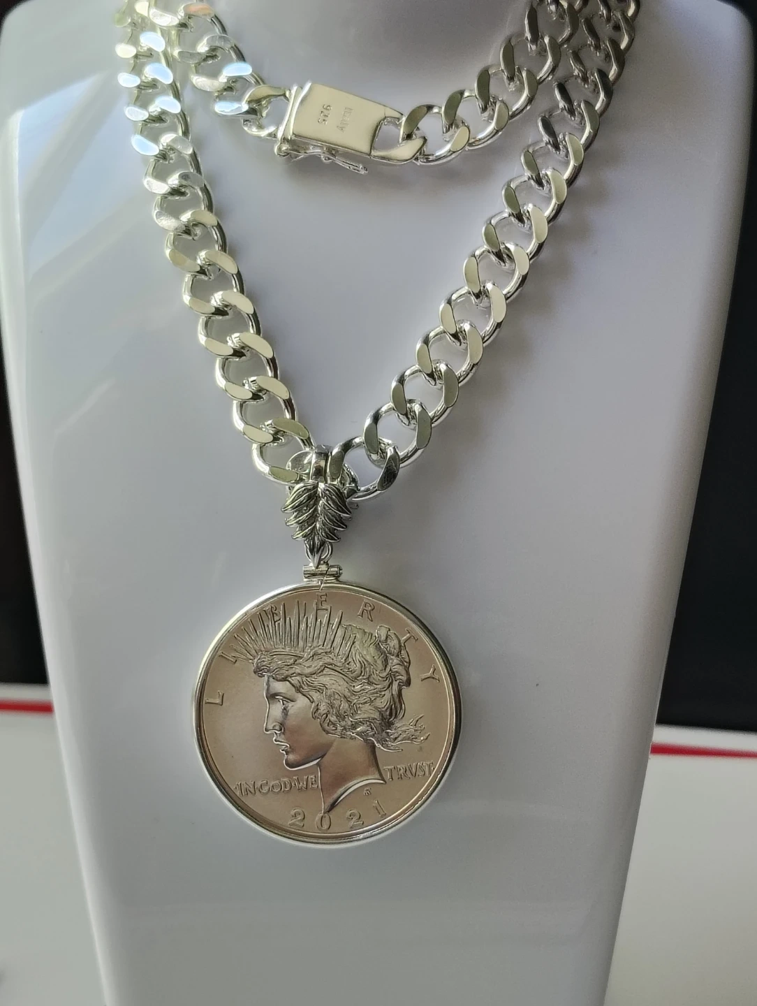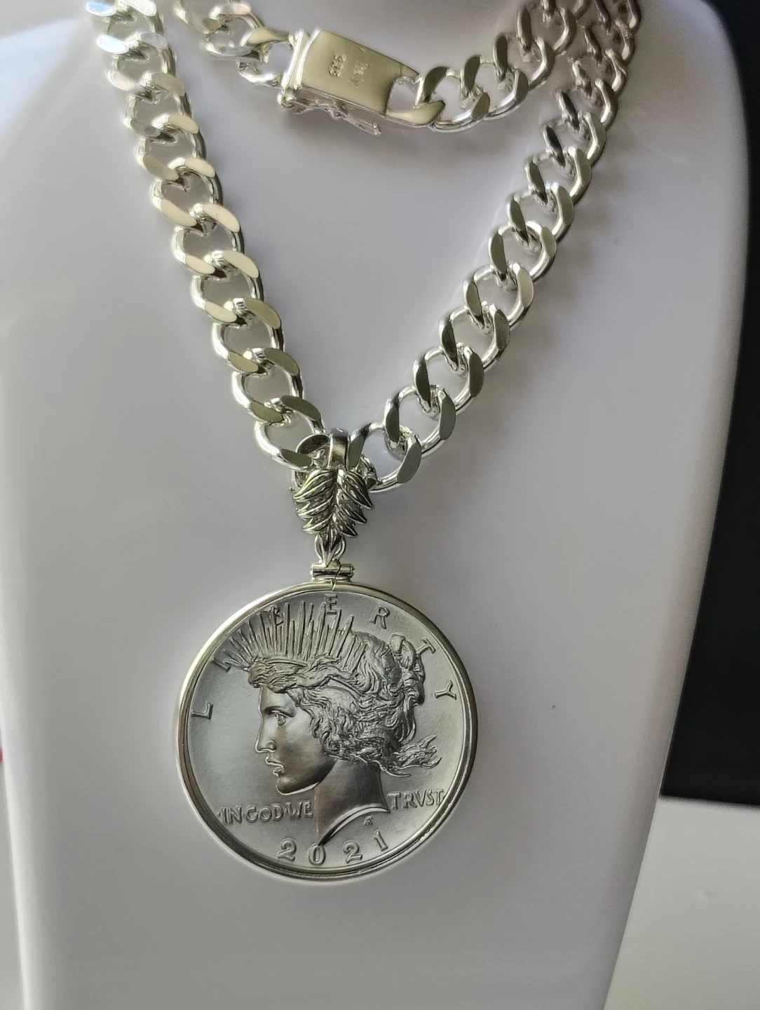 Collar plateado brillante y único con silver Peace dollar 2021 . Moneda de colección 100 años aniversario. Certificado MS 69 NGC.una verdadera joya numismatico.