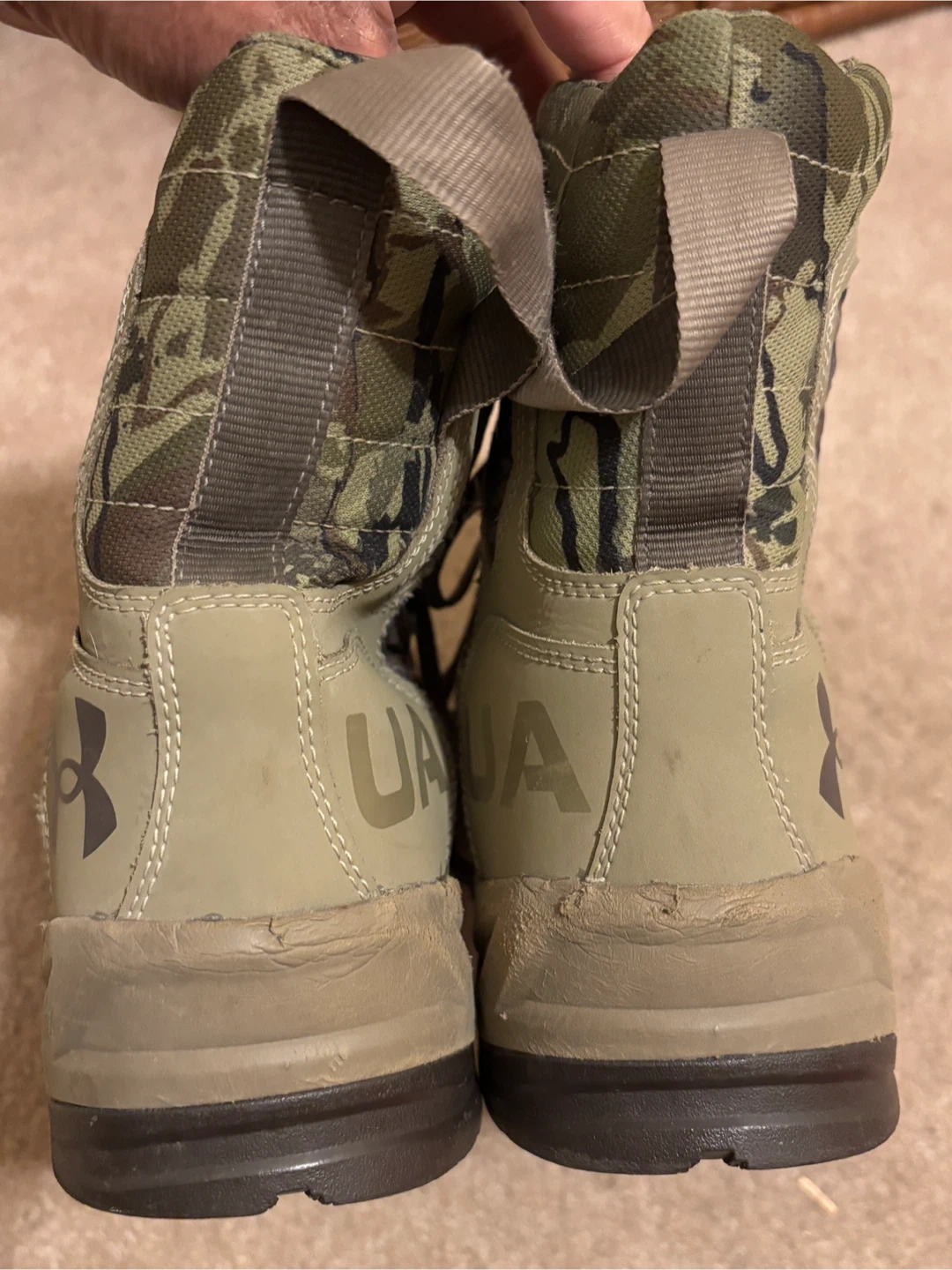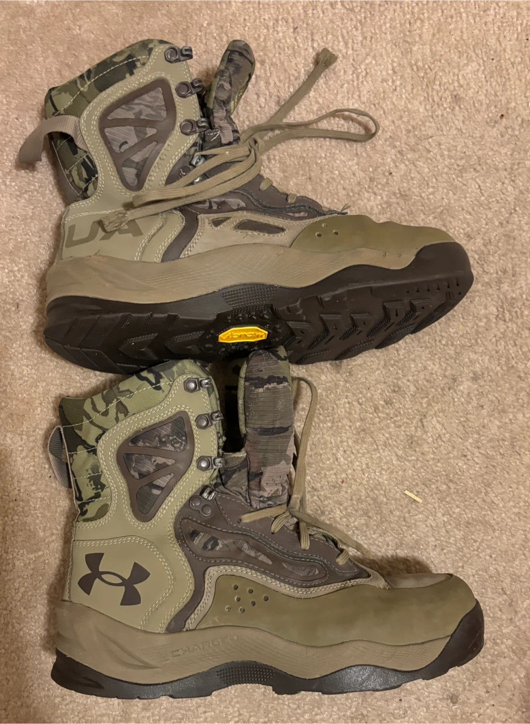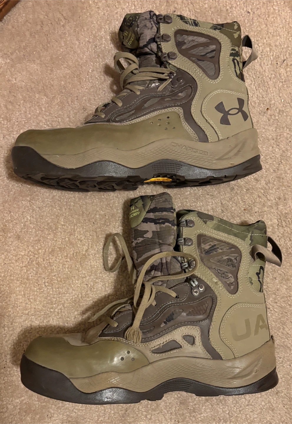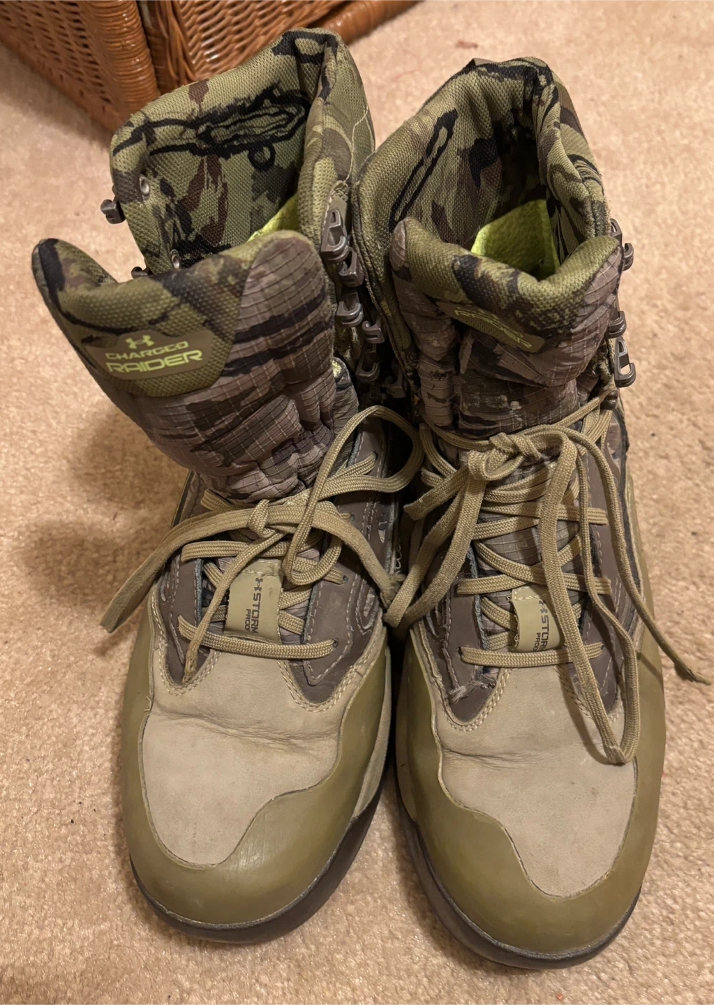 97Selling a pair of Under Armour Charged Raider boots in a camo and brown colourway. The size is a US 9. These boots feature a Vibram sole for great traction and durability. They are in good condition and ready for your next adventure!