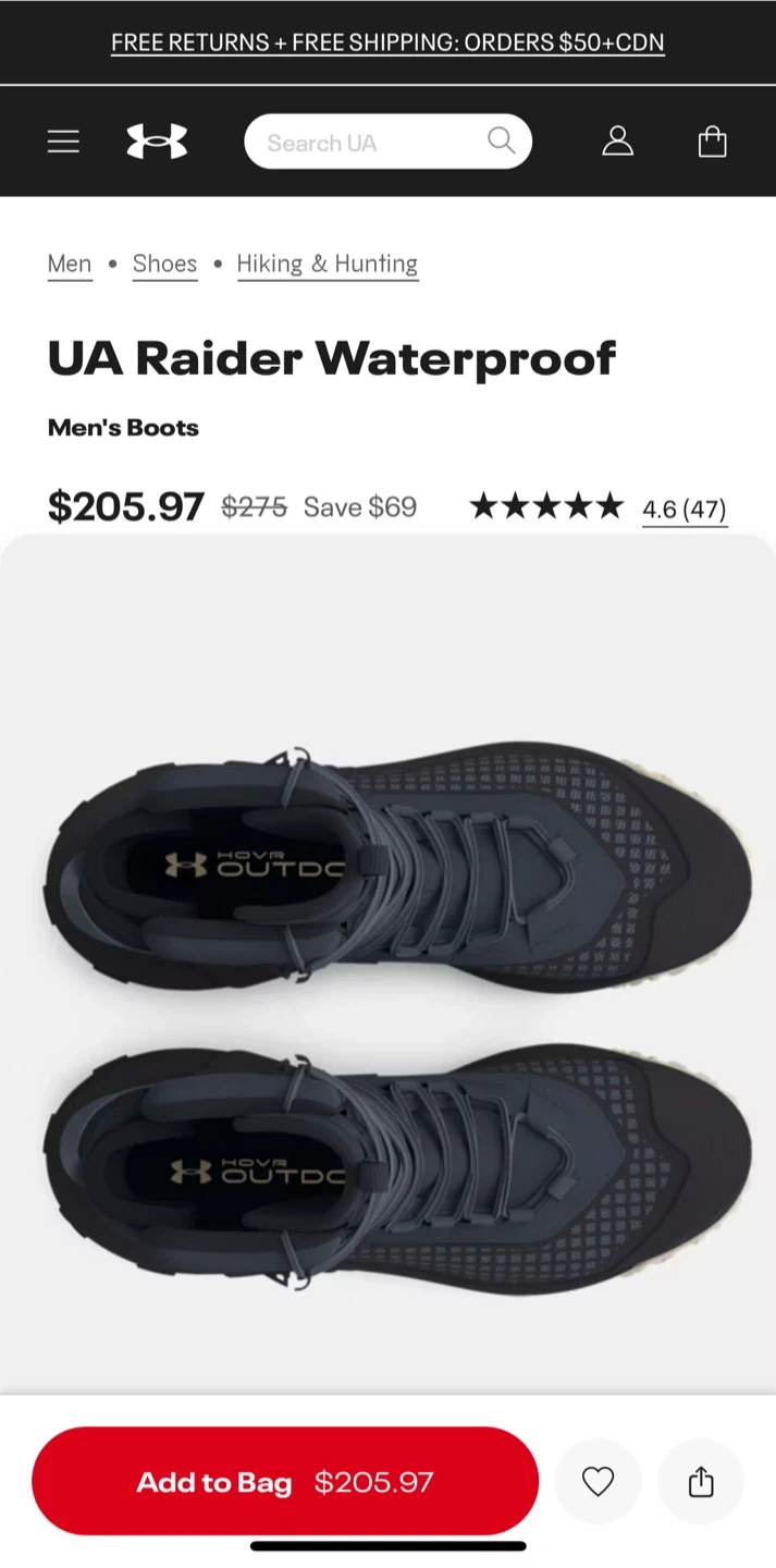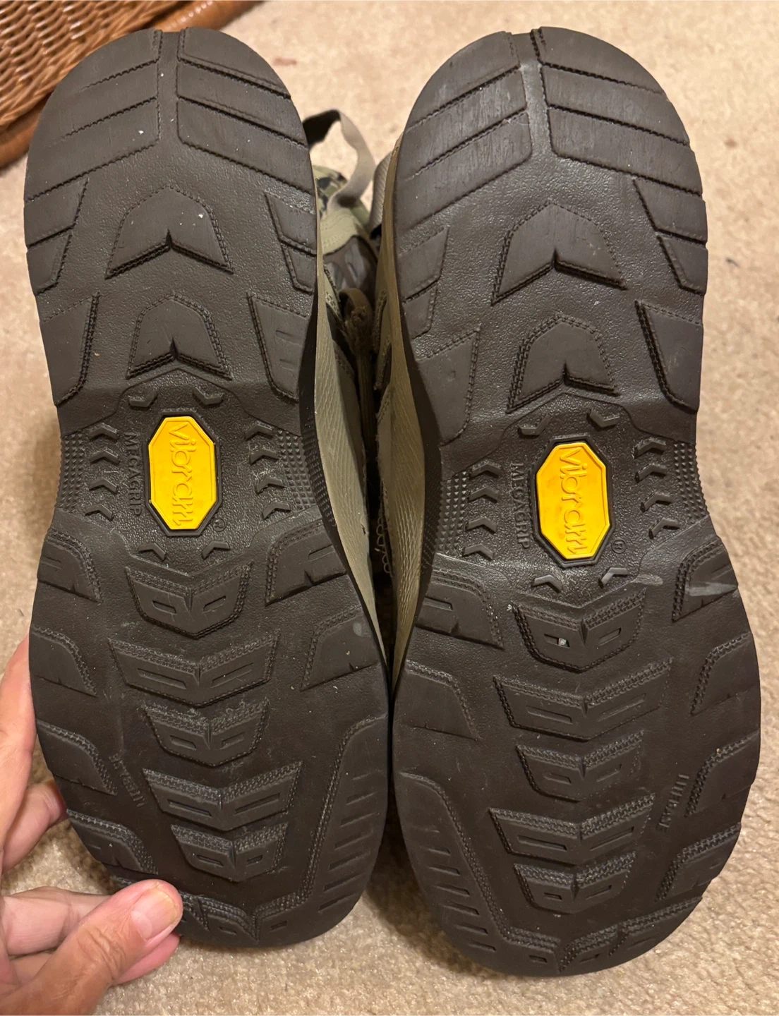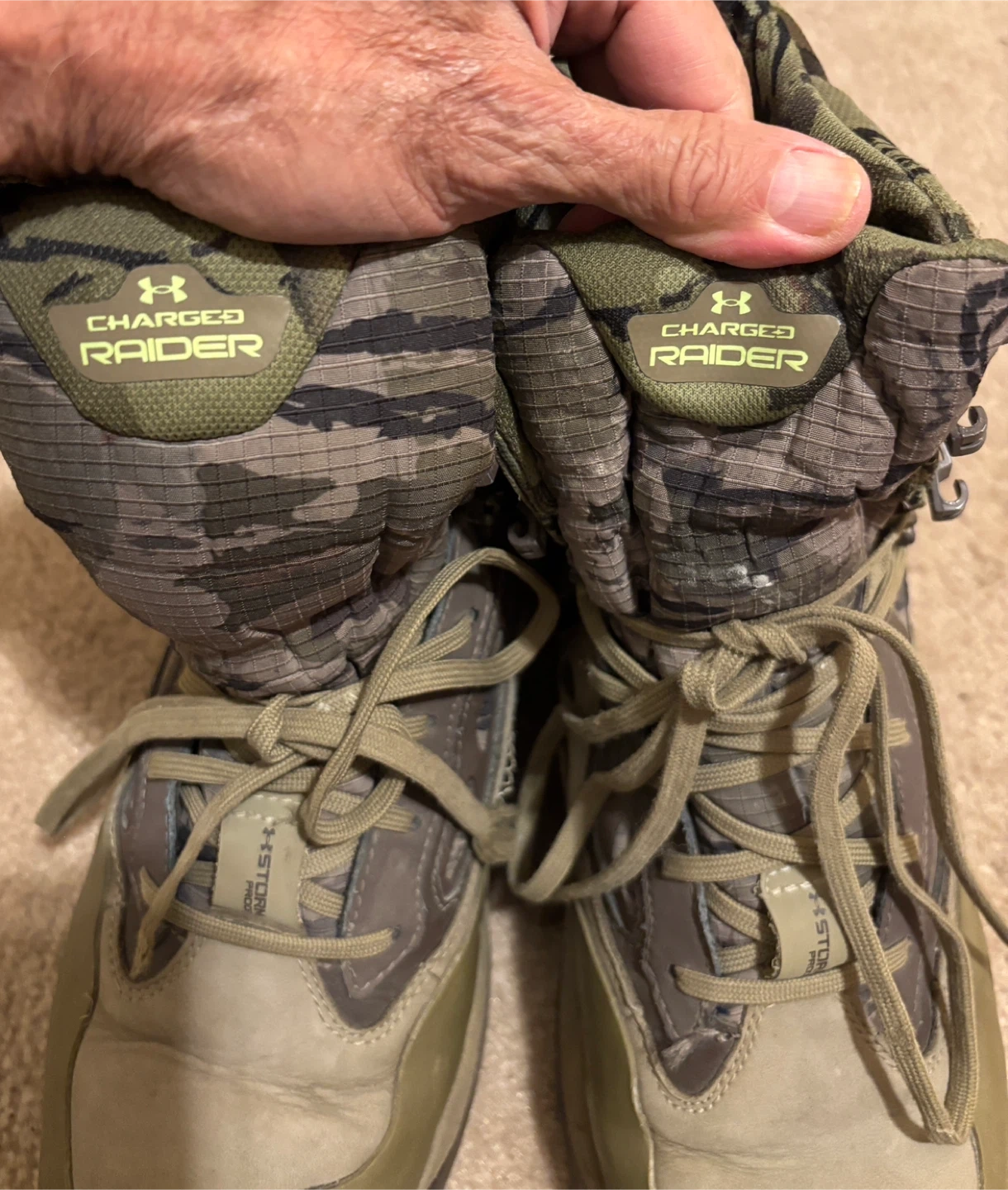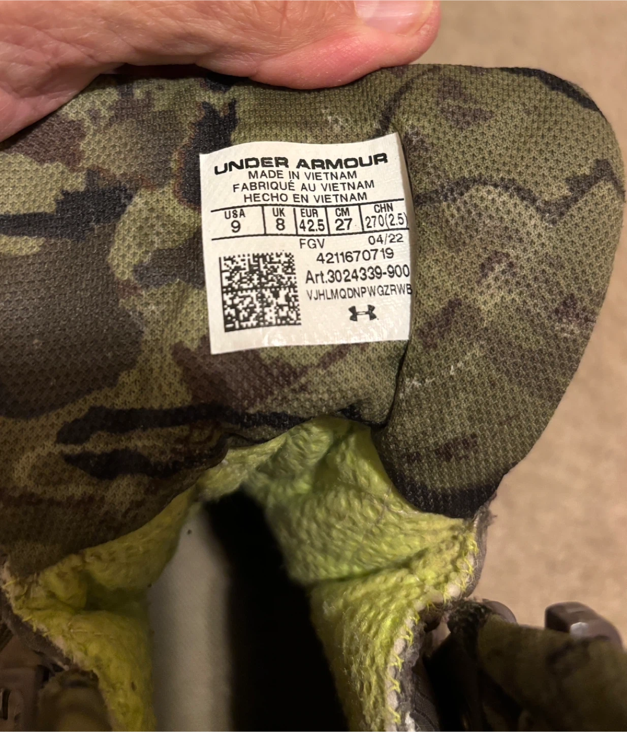 97Selling a pair of Under Armour Charged Raider boots in a camo and brown colourway. The size is a US 9. These boots feature a Vibram sole for great traction and durability. They are in good condition and ready for your next adventure!