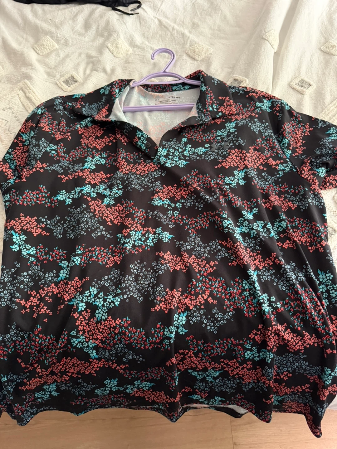 60Selling a cute Under Armour polo shirt with a floral pattern! It's in great condition and perfect for golfing or everyday wear size xxl