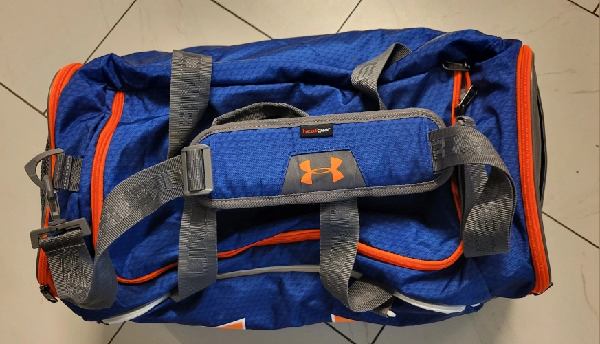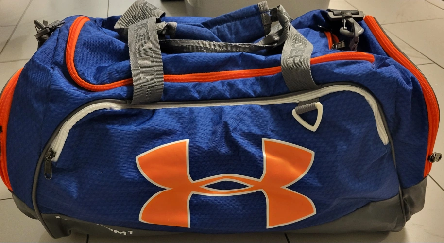Large duffel bag. Blue with orange accents. Multiple pockets and compartments. Durable material. Great for the gym or travel.