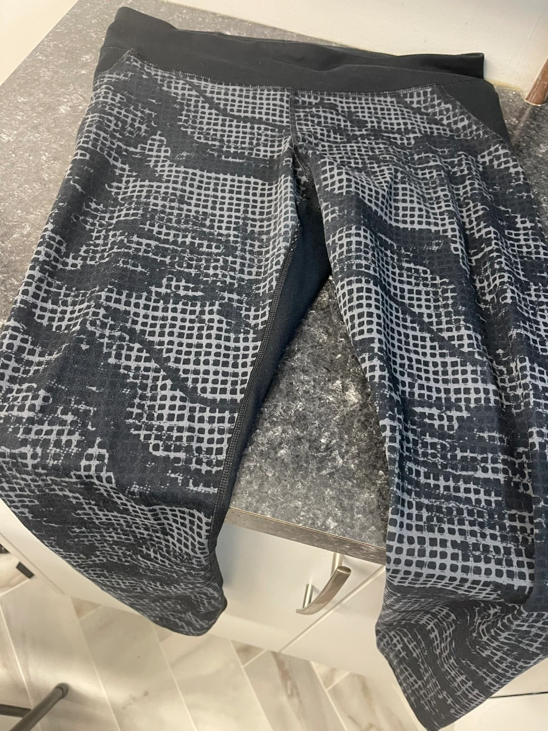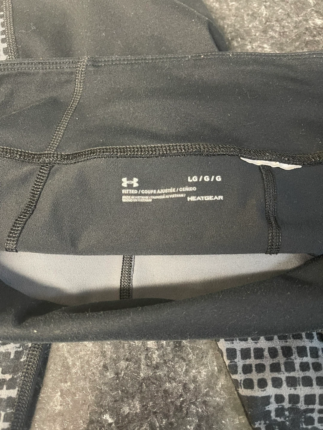 18Selling a pair of Under Armour HeatGear fitted leggings in size large. They are black with a grey patterned design on the lower legs. These leggings are designed to keep you cool and comfortable during workouts!