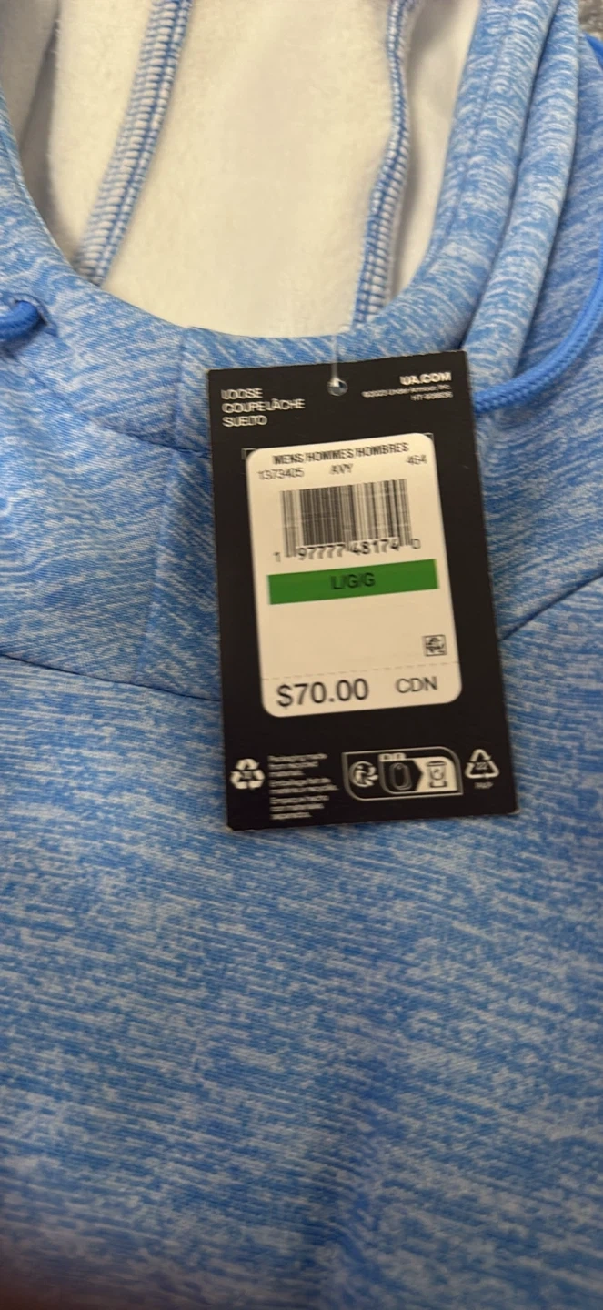 Selling a light blue Under Armour hoodie in size large. It's in great condition and ready for a new home! The tag shows it was originally $70 CAD.