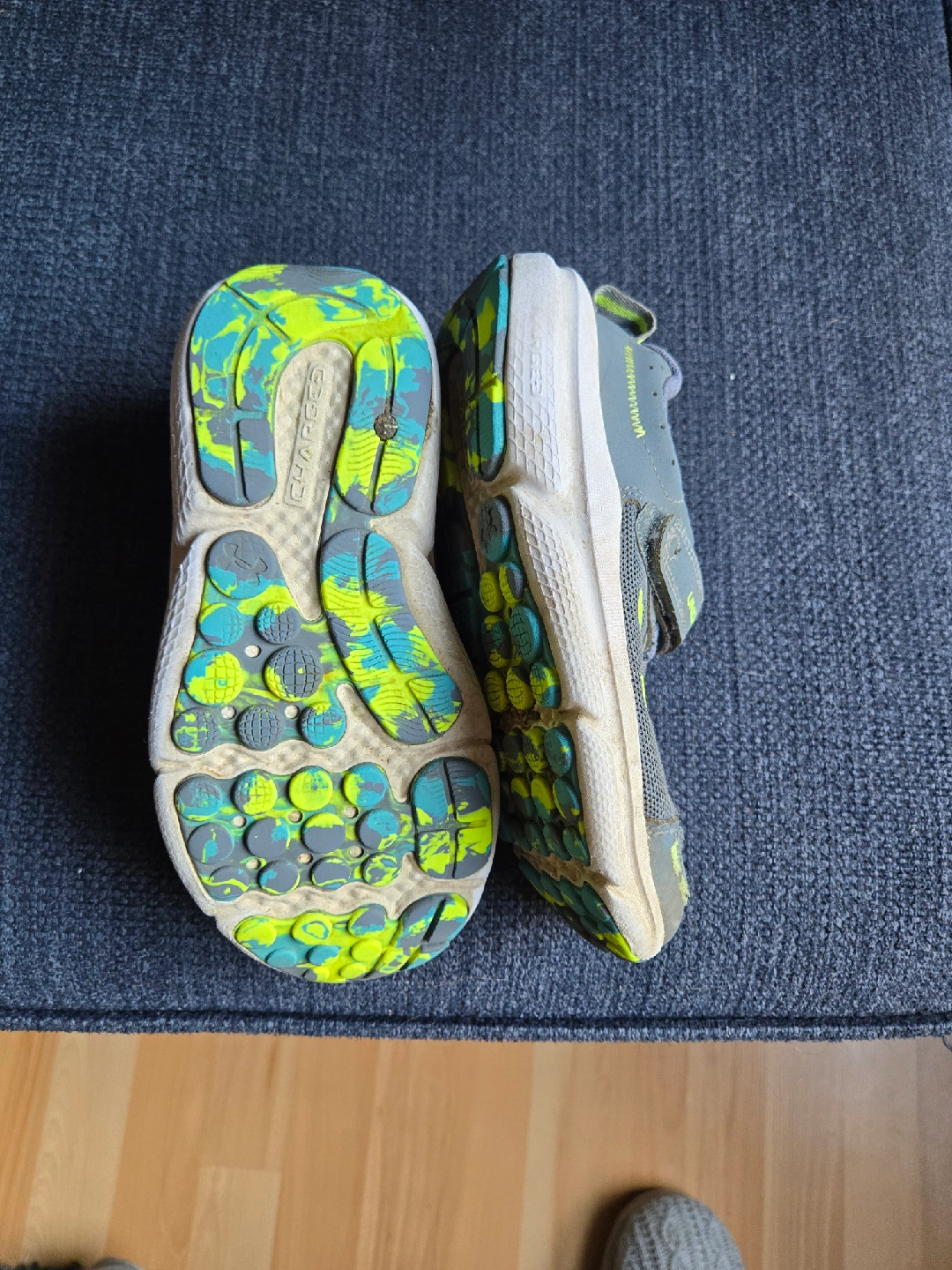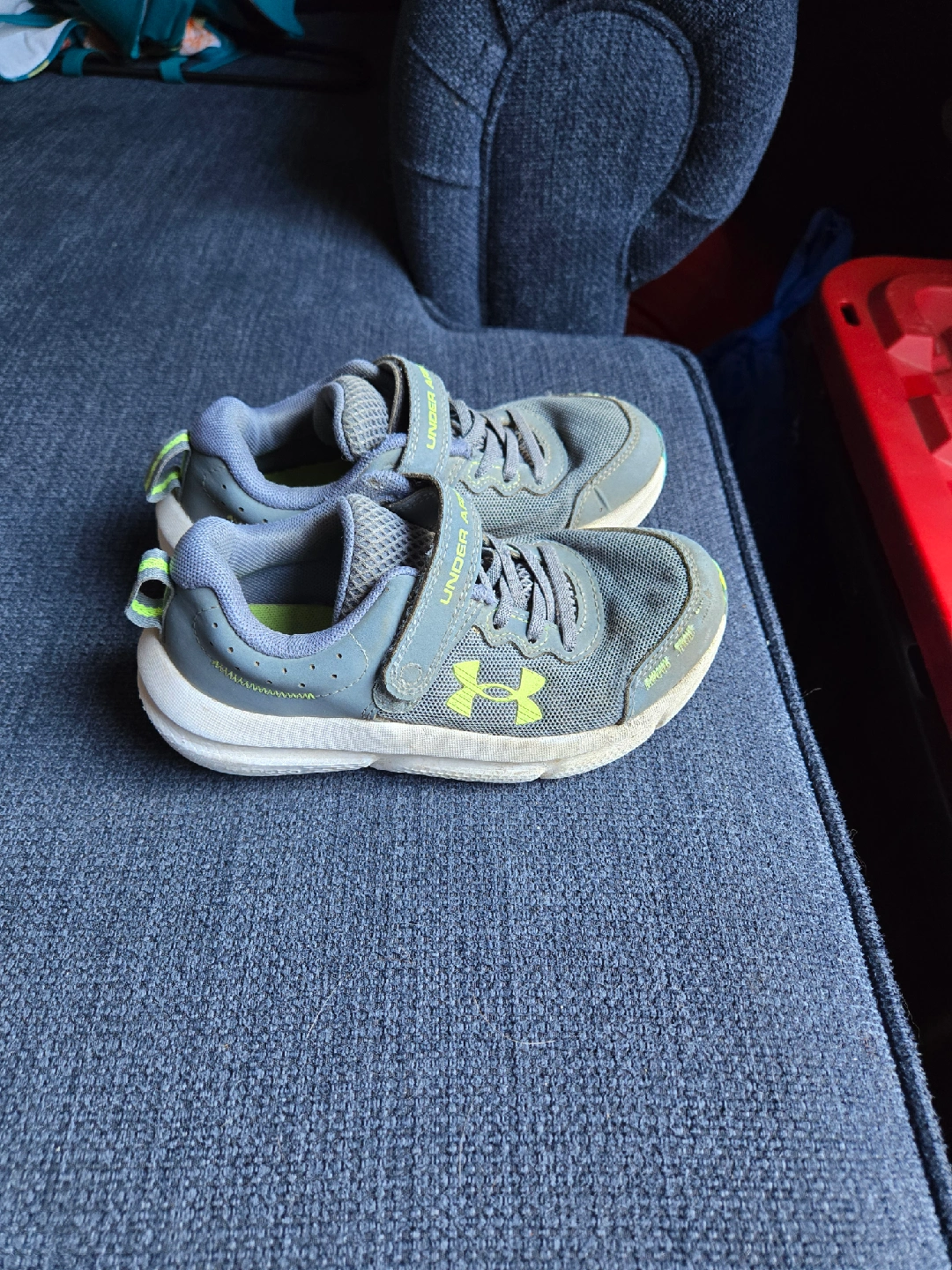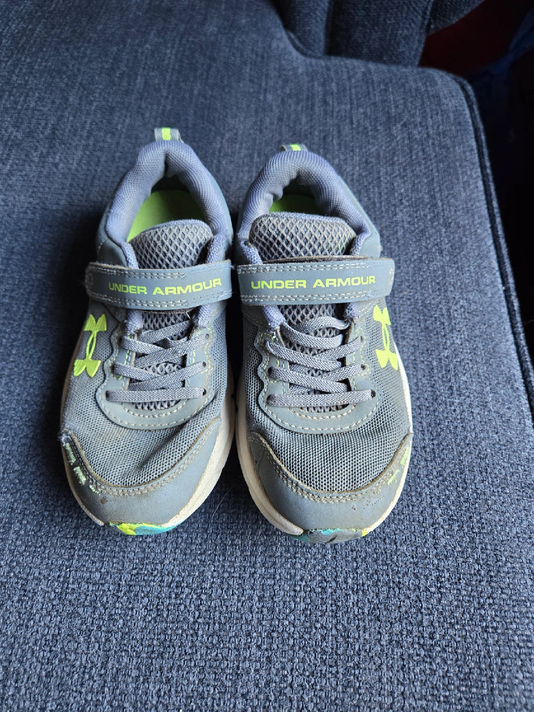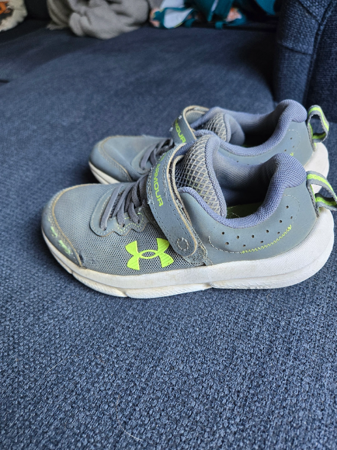 60Selling a pair of Under Armour kids' shoes in size 11. They're grey with a lime green logo and accents. These shoes have a Velcro strap and laces, perfect for little ones!