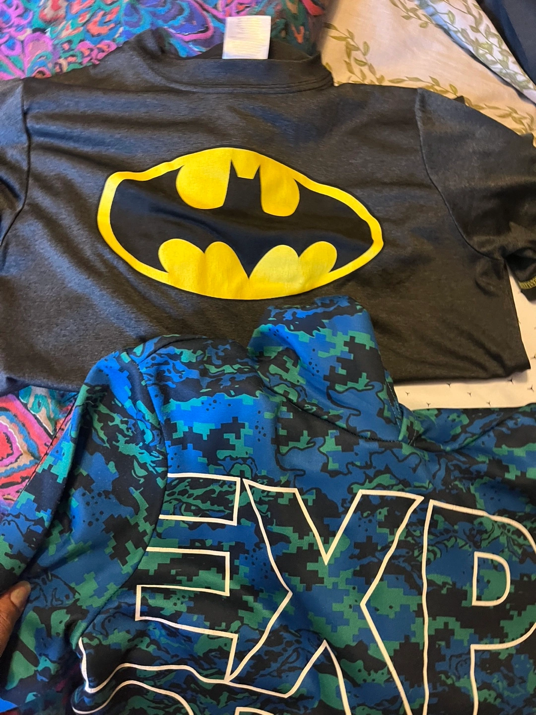 A collection of clothing items including Under Armour socks, an Amiri shirt, Adidas pants, and an Explore hoodie from smoke and pett free home