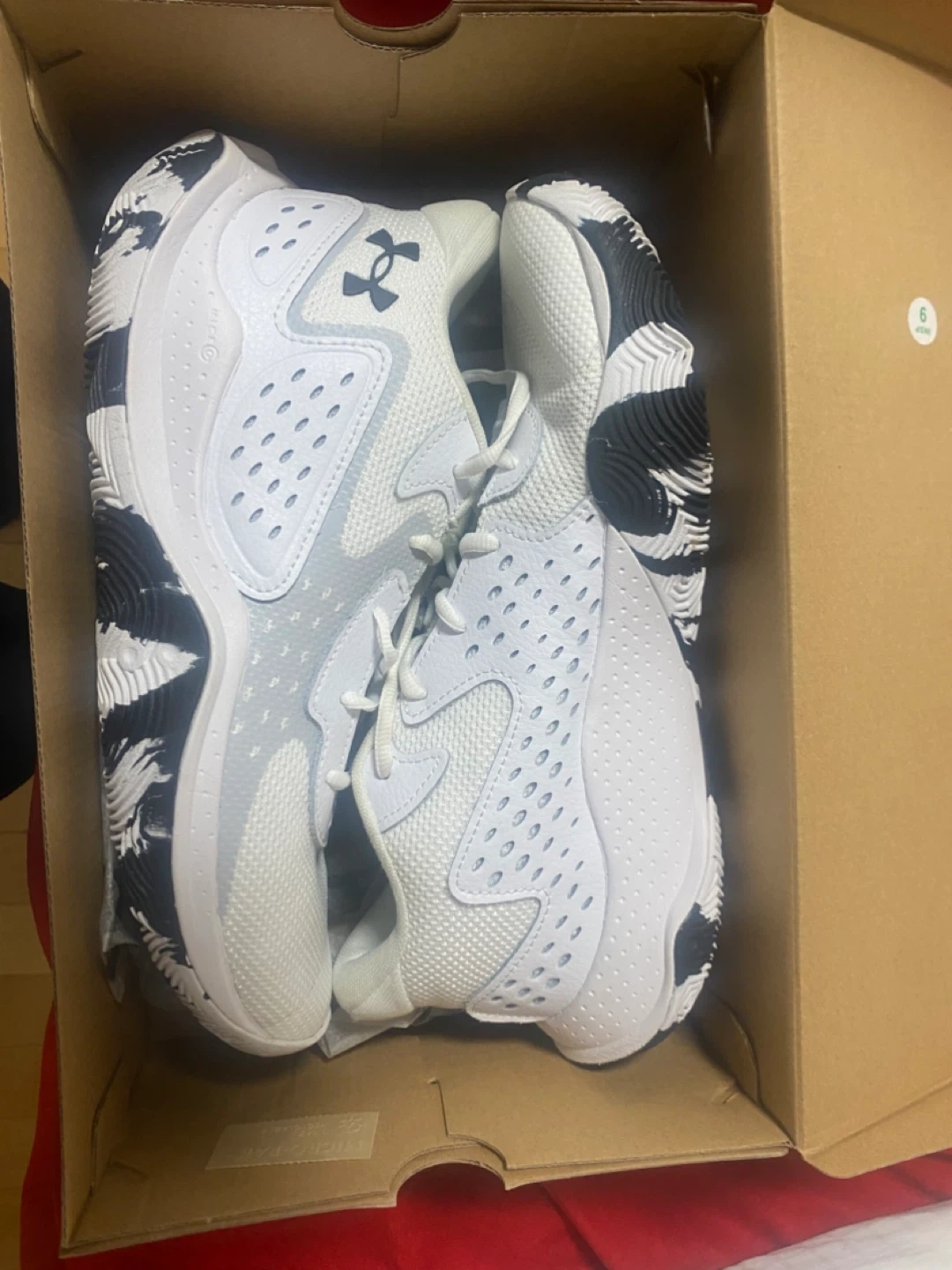 Selling a pair of Under Armour Basketball shoes in white. They come in the original box and are in great condition. The size is a US 10.
