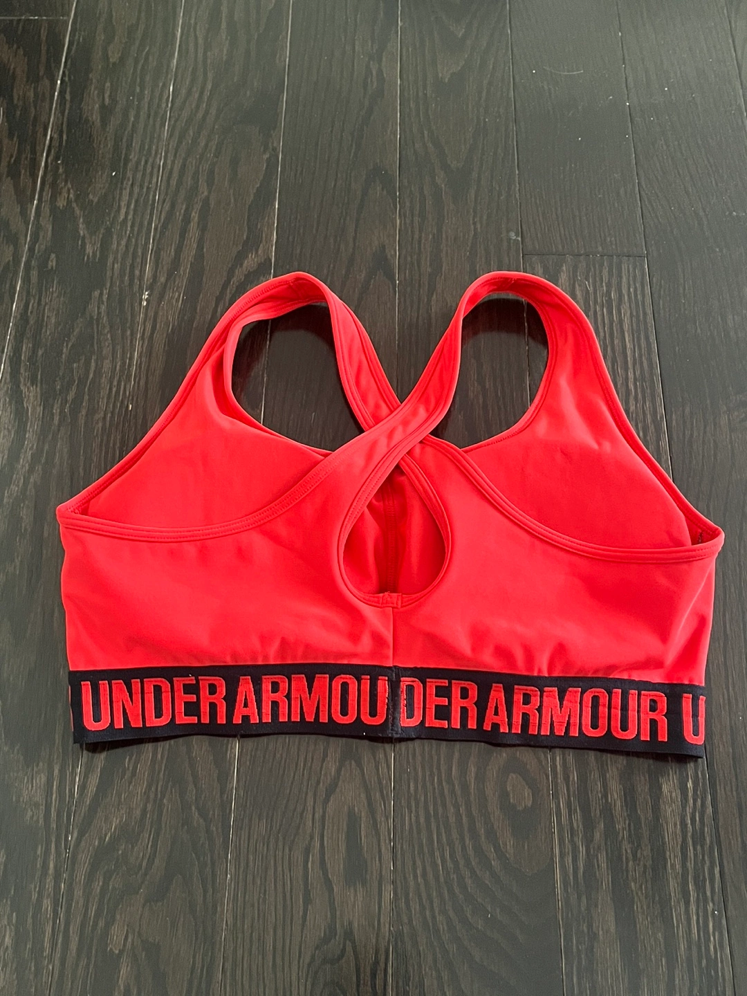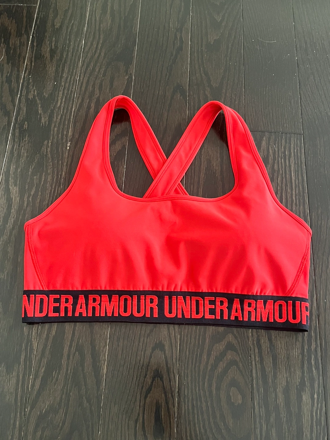 Bold red sports bra with supportive design. Ideal for active wear. Cross back design. Good preloved condition Pickup Brampton or downtown Toronto Approximate measurements: Waist 13.5” PTP/Chest 15” Top to bottom 13”