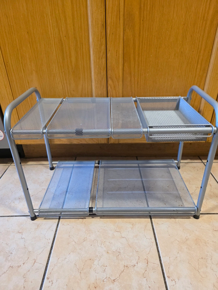 Metal under the sink storage has adjustable size shelves can be rearranged to whatever suits you best one of the shelves has a basket