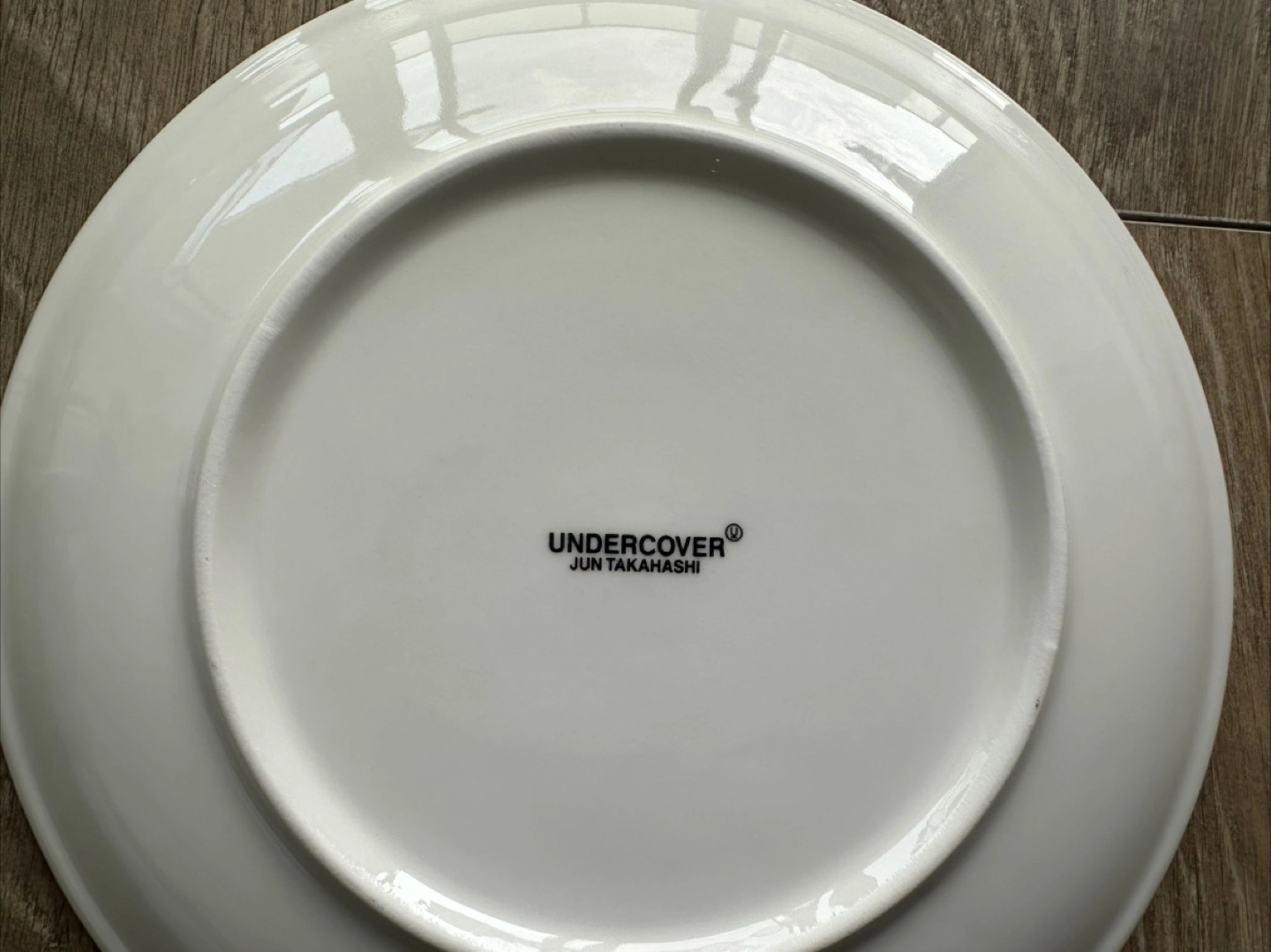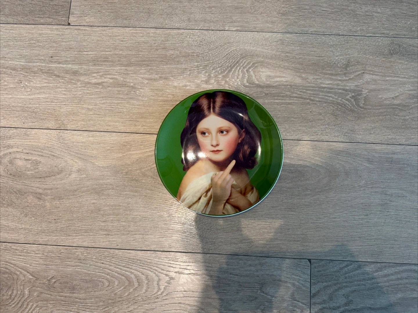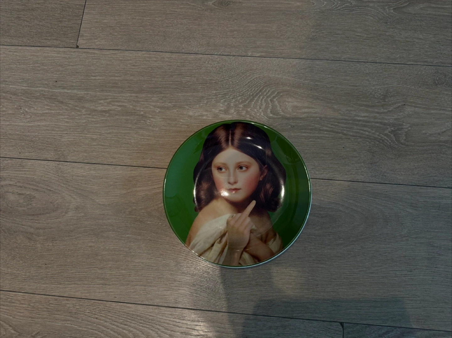 9050$ for 3 plate This is a plate by Undercover Jun Takahashi. It features a portrait on a green background. It's a unique piece for any collector or fan of the brand