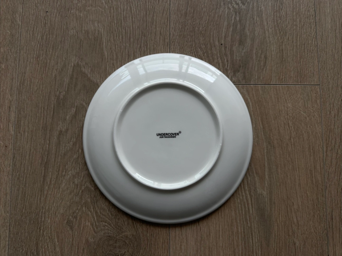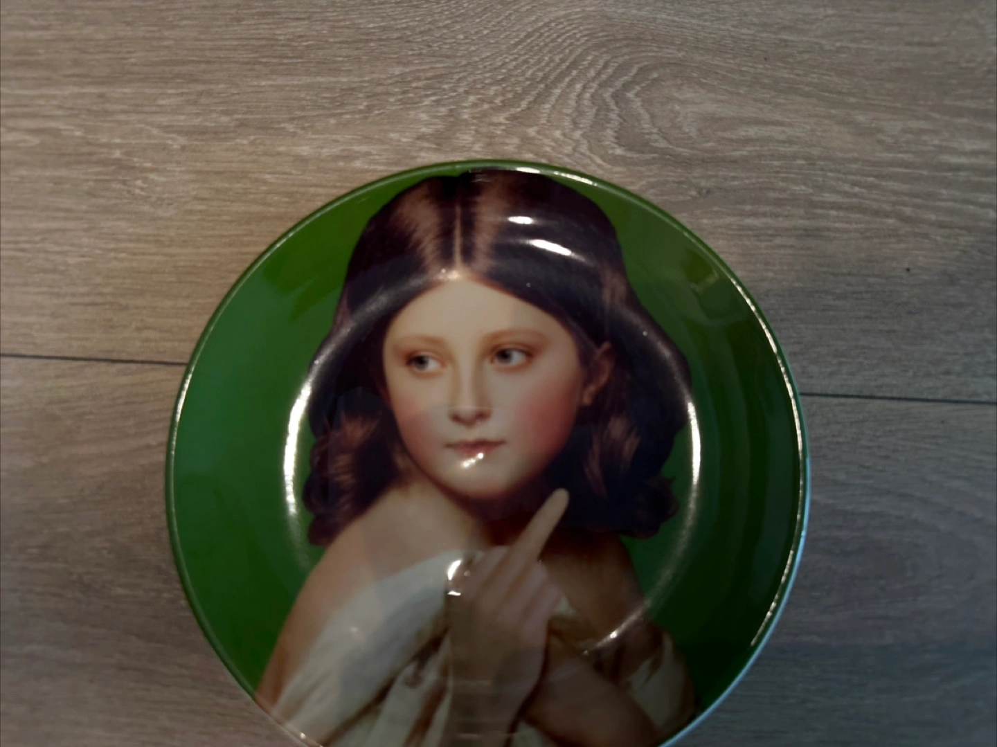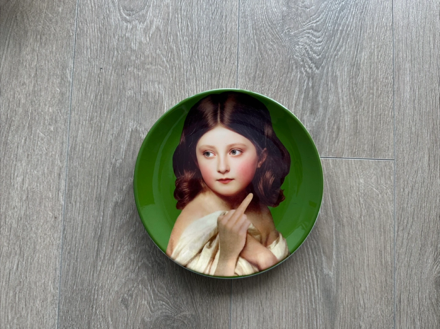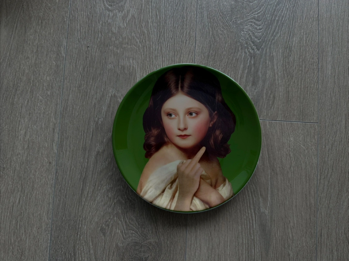 9050$ for 3 plate This is a plate by Undercover Jun Takahashi. It features a portrait on a green background. It's a unique piece for any collector or fan of the brand