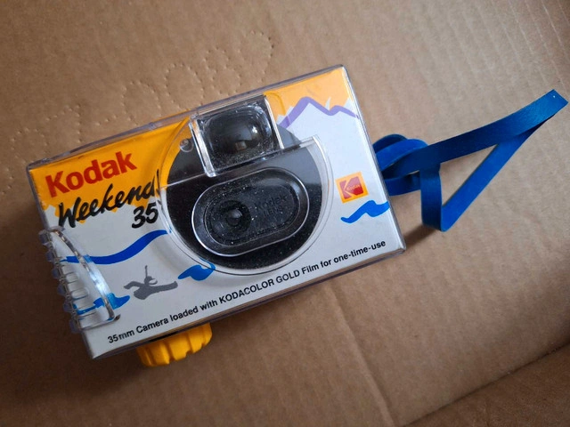 75Waterproof Kodak Weekender disposable 35mm camera, for use or display. Kodacolor GOLD, 27 exposure, 400 ISO film. Excellent for underwater photography. Waterproof to 12 feet. So it's obviously also safe in bad weather . Expired, but still airtight factory sealed. Stored refrigerated at ~ 4°C (40°F) for about the last 20 or so years. Smoke free home. Please see my other listings.