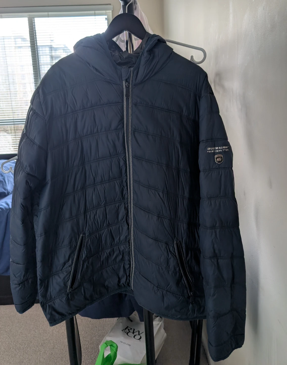 Navy blue quilted hooded jacket by Point Zero. It's a men's size large with a full zip closure. This ultralight jacket is great for layering or wearing on its own during cooler weather.