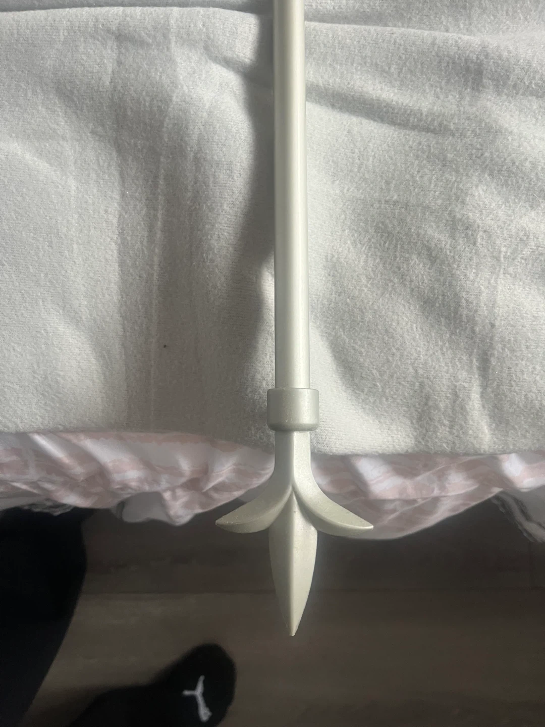 A simple white metal curtain rod. It's about 6 feet long and has a decorative finial at one end. This rod would be useful for hanging curtains in a bedroom or living room.