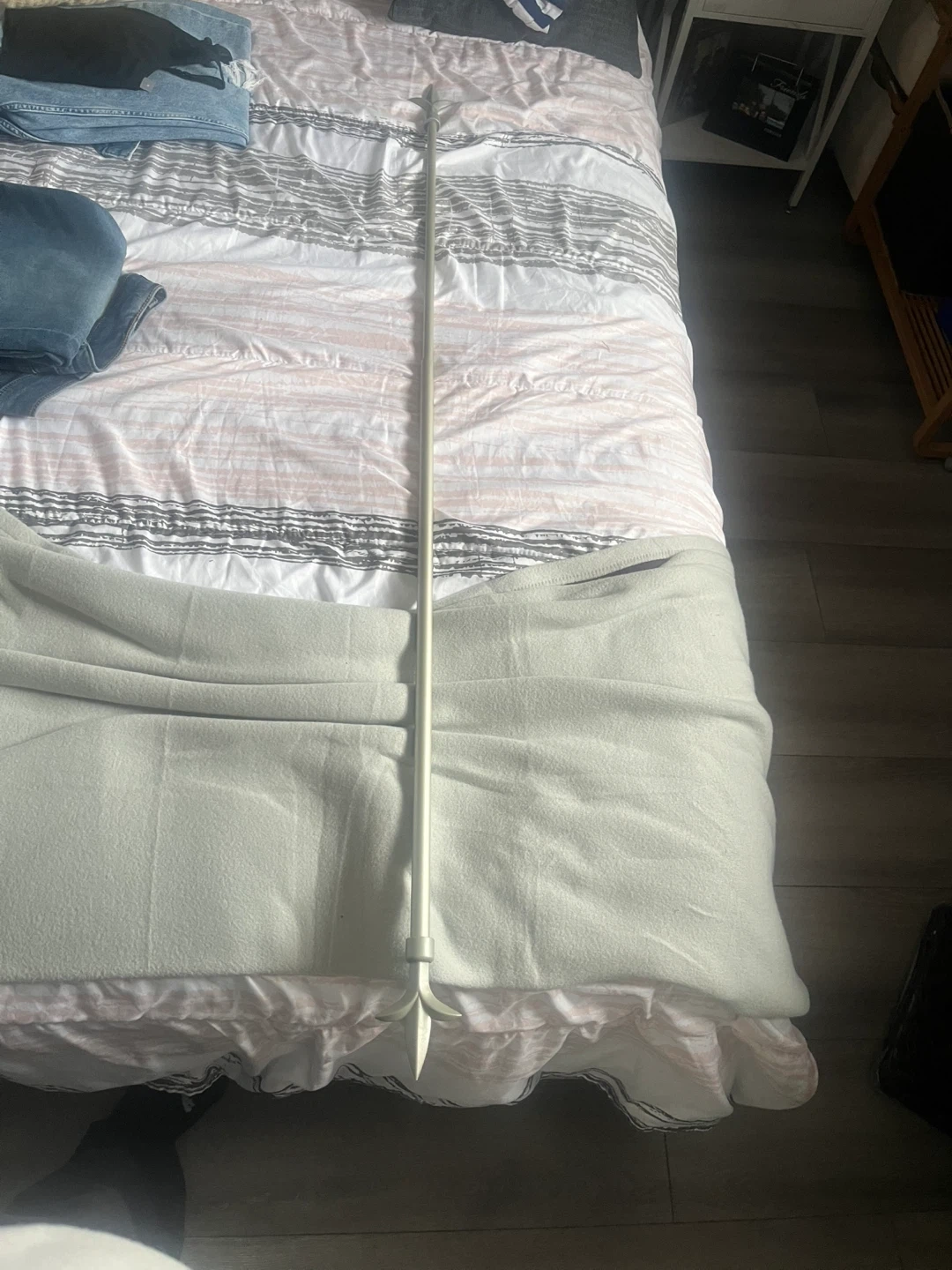 A simple white metal curtain rod. It's about 6 feet long and has a decorative finial at one end. This rod would be useful for hanging curtains in a bedroom or living room.