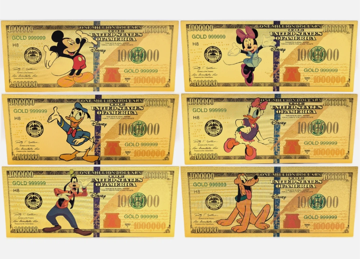 Selling a set of Disney million-dollar bills featuring Mickey, Minnie, Donald, Daisy, Goofy, and Pluto! These novelty bills are a fun collectible for any Disney fan
