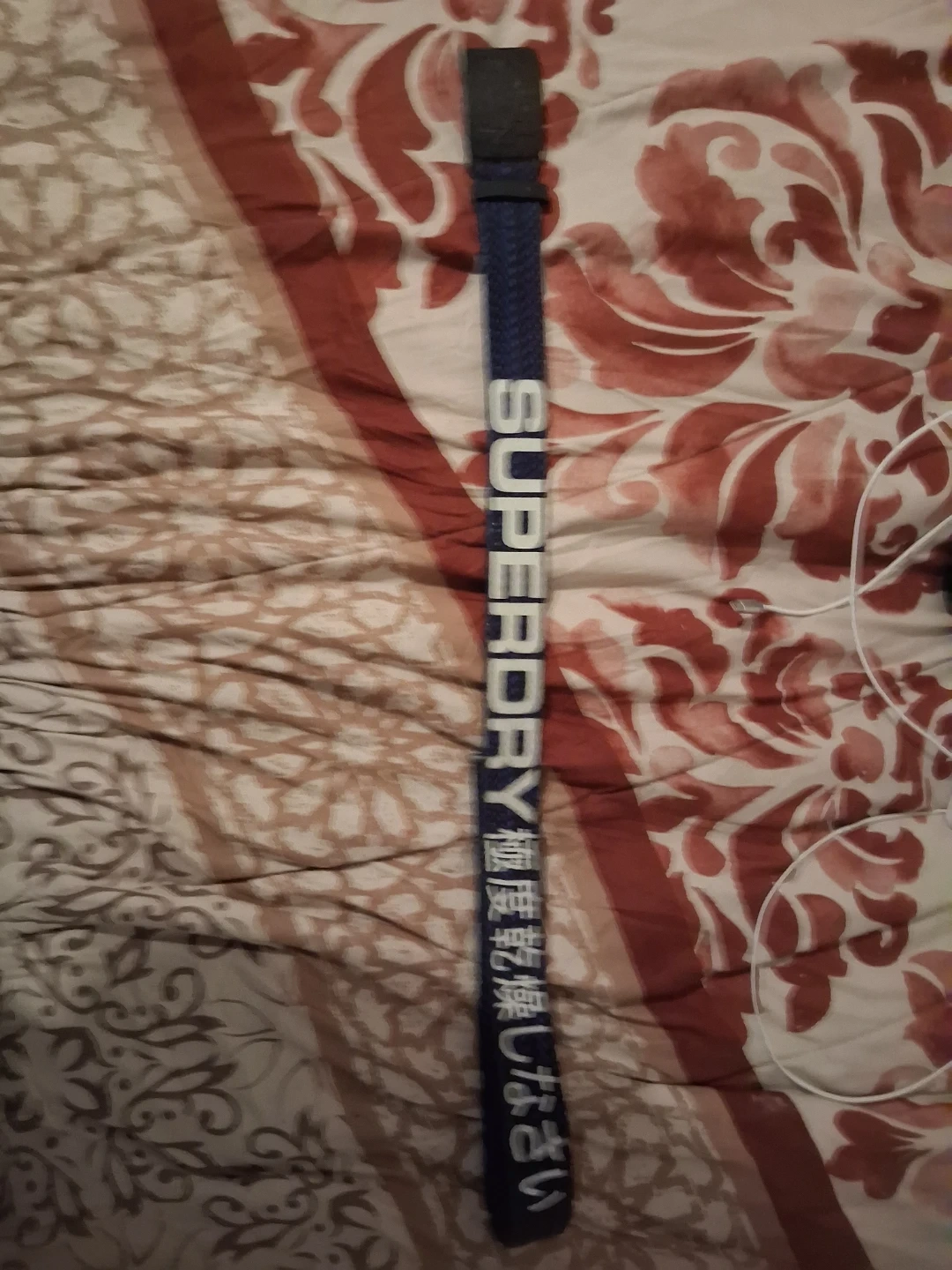 This is a blue Superdry belt with white lettering. It has a black buckle and some Japanese characters printed on it. The belt material appears to be woven fabric.