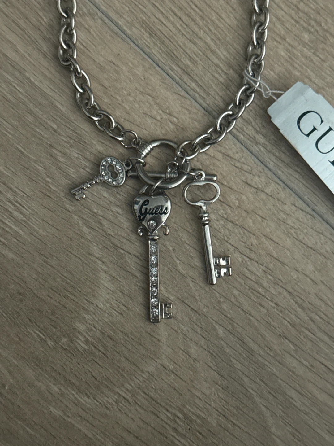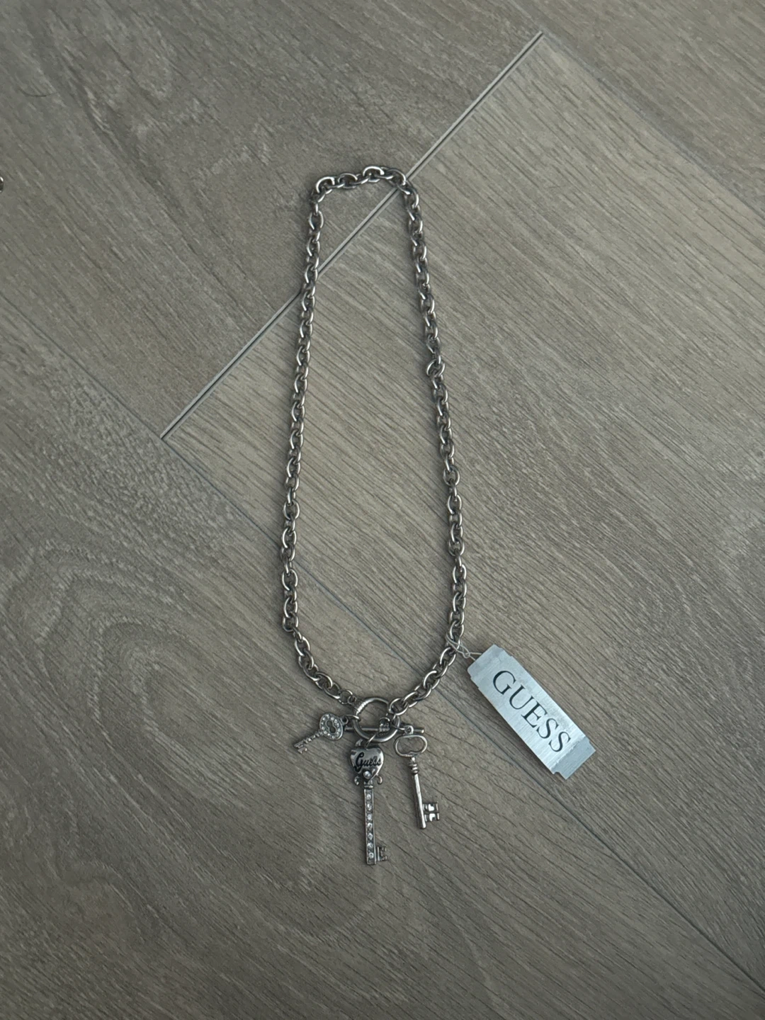 This is a silver-tone Guess necklace featuring multiple key charms. One charm is a heart shape with 'Guess' inscribed and clear stones. It's a stylish accessory. Its never worn selling since im a student.