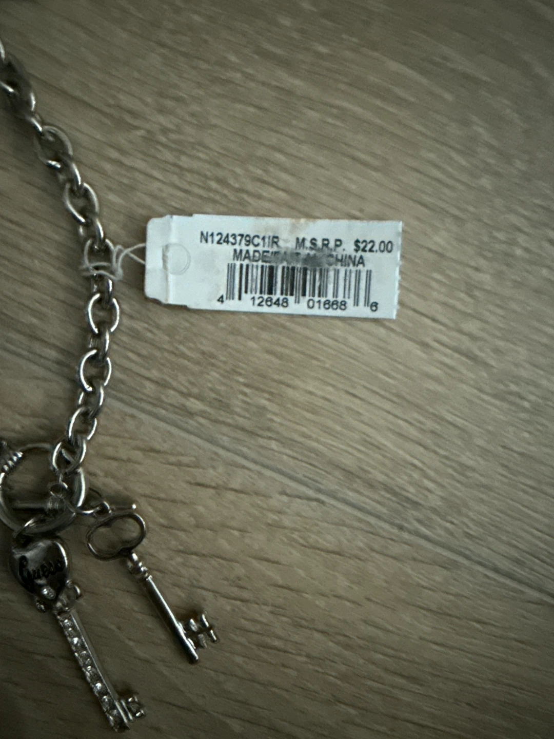 This is a silver-tone Guess necklace featuring multiple key charms. One charm is a heart shape with 'Guess' inscribed and clear stones. It's a stylish accessory. Its never worn selling since im a student.