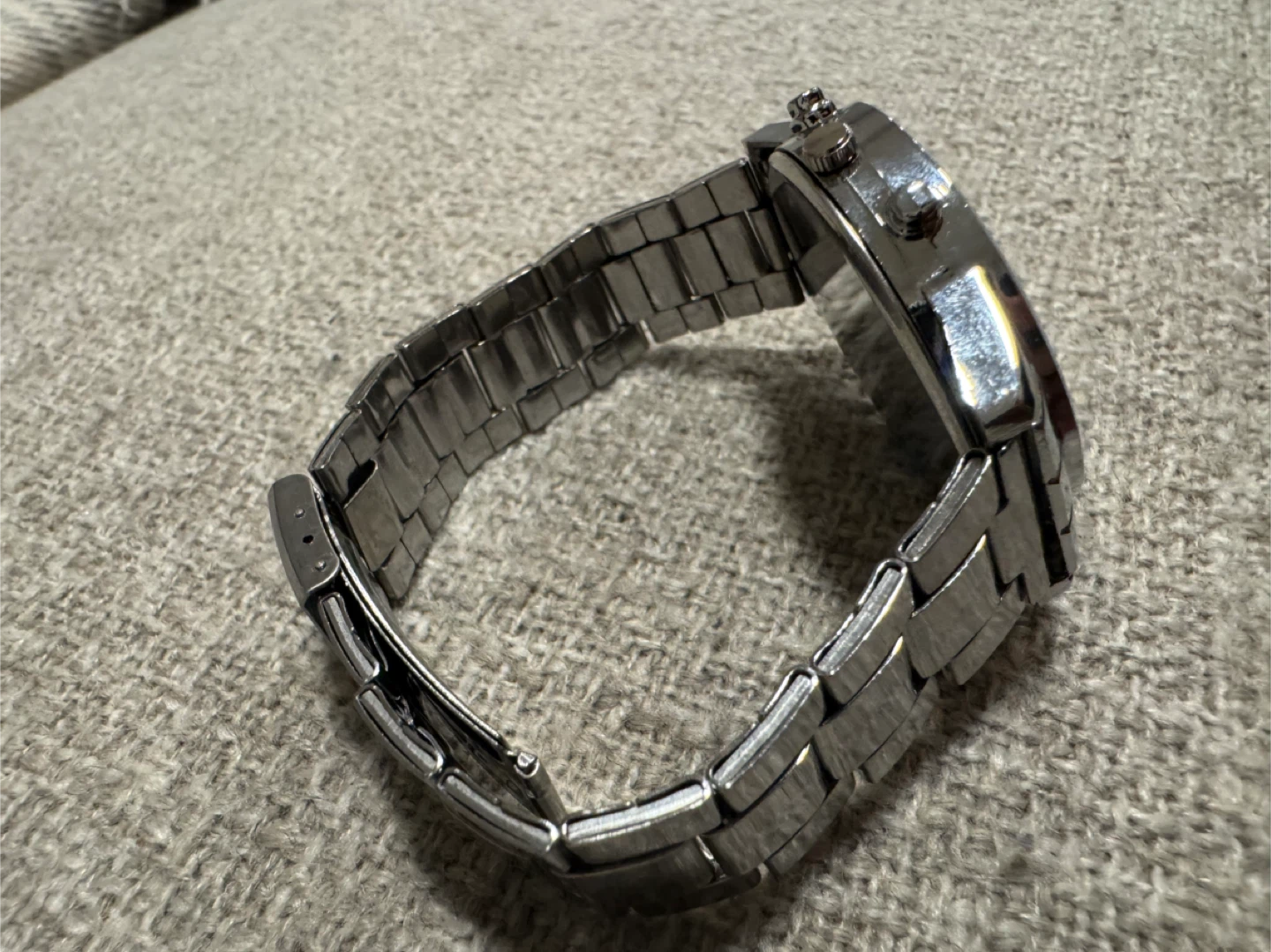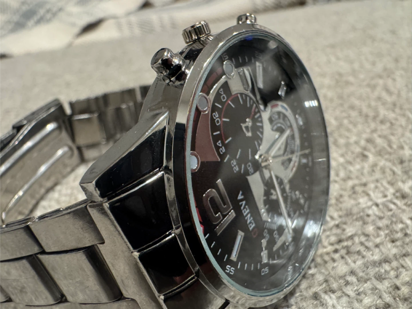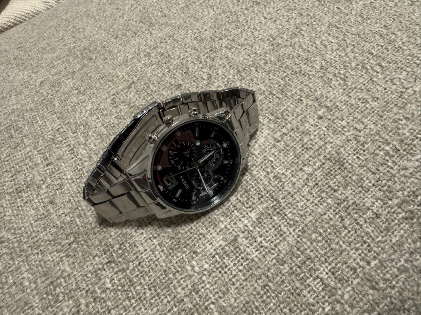 Selling a men's Geneva watch with a silver-tone finish. It has a chronograph style dial with multiple subdials and a stainless steel bracelet. The watch is in great condition and ready to wear!