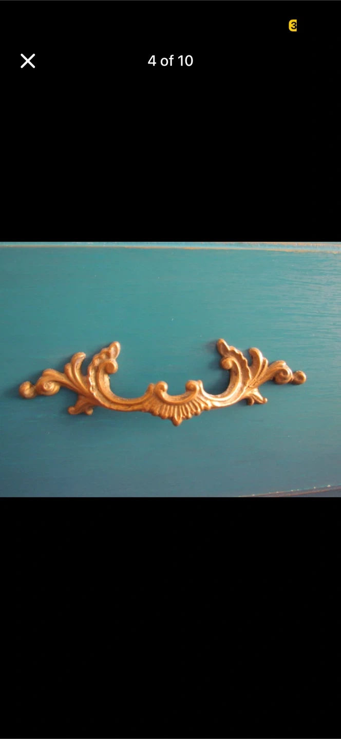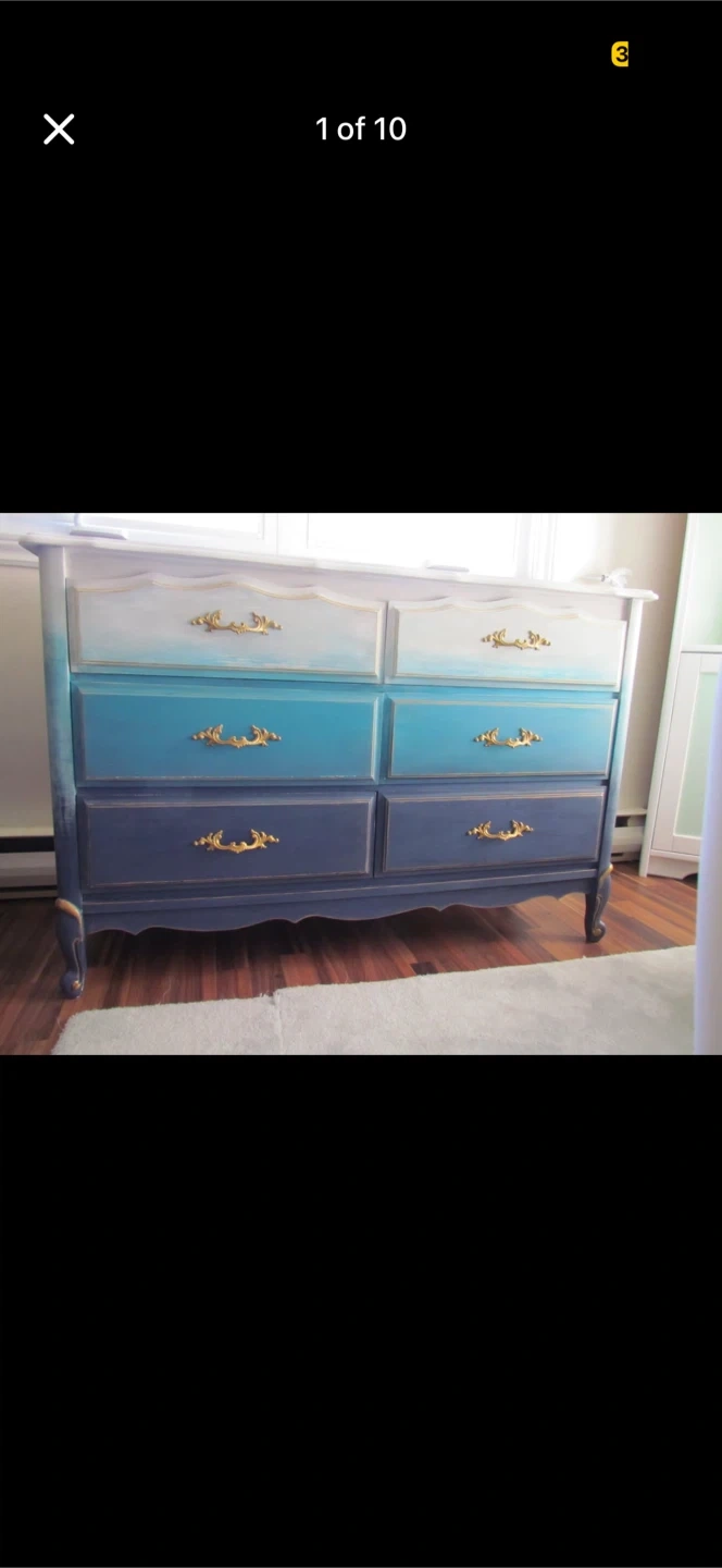 This dresser has been refinished with a beautiful ombre blue paint job and ornate gold hardware. It features six drawers with ample storage space. This piece would make a lovely addition to a bedroom or living area!