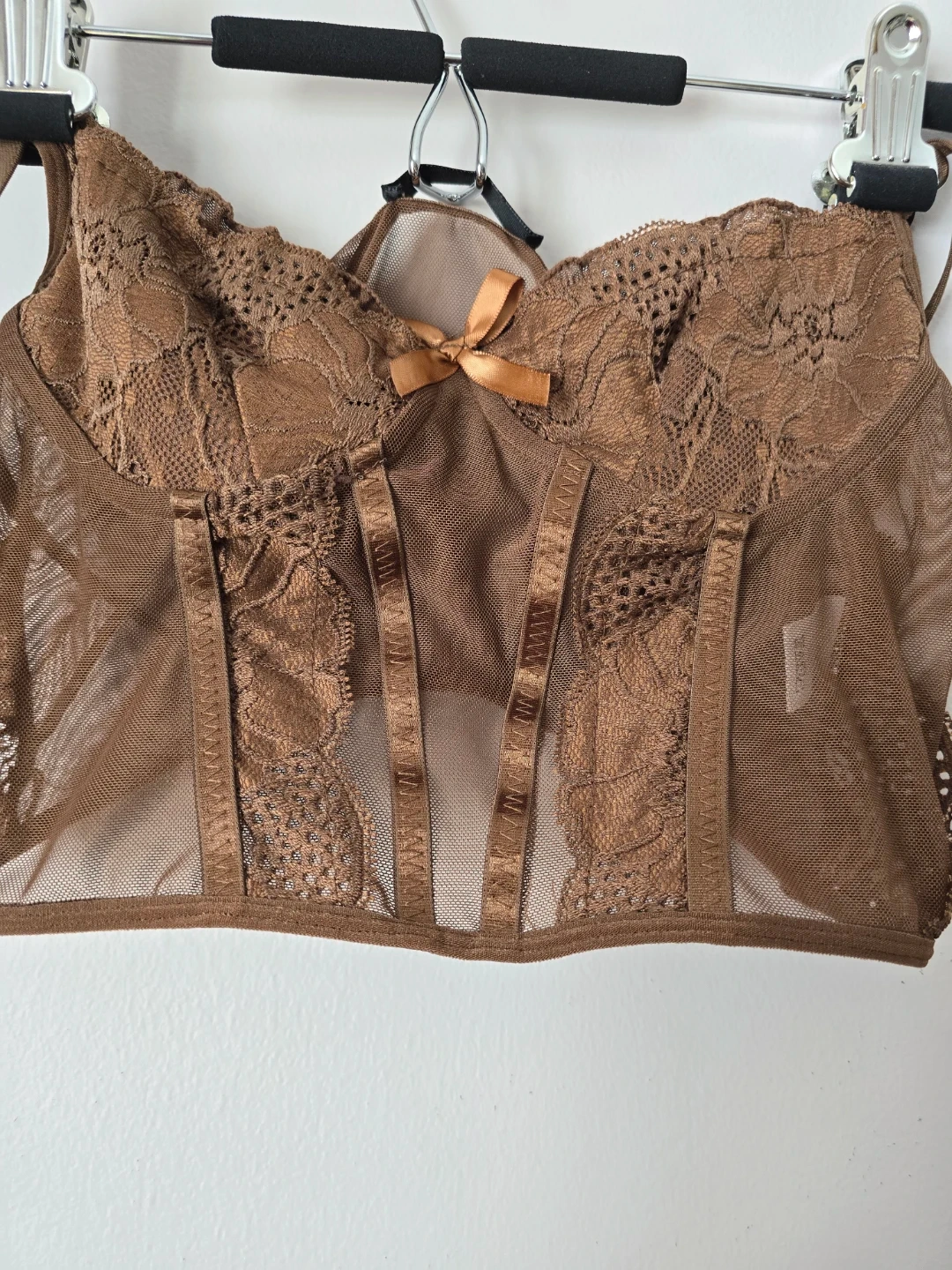 Sheer brown lace corset top with decorative stitching and a small satin bow accent. It's made of mesh material with lace panels. This top adds a touch of elegance.
