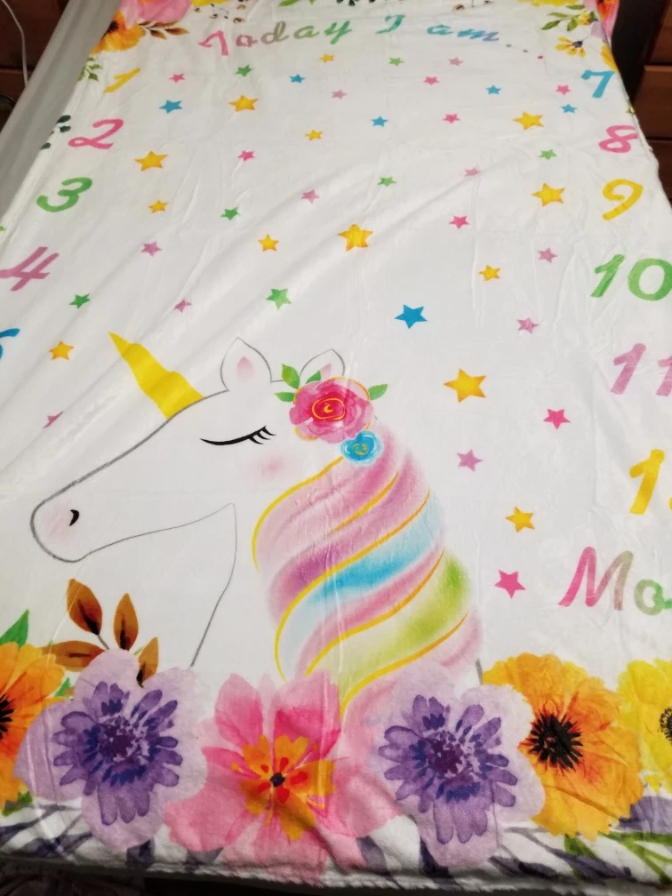 240Here's a cute milestone blanket featuring a unicorn and colourful flowers! It has numbers for tracking your baby's growth month by month. Fleece. Brand new