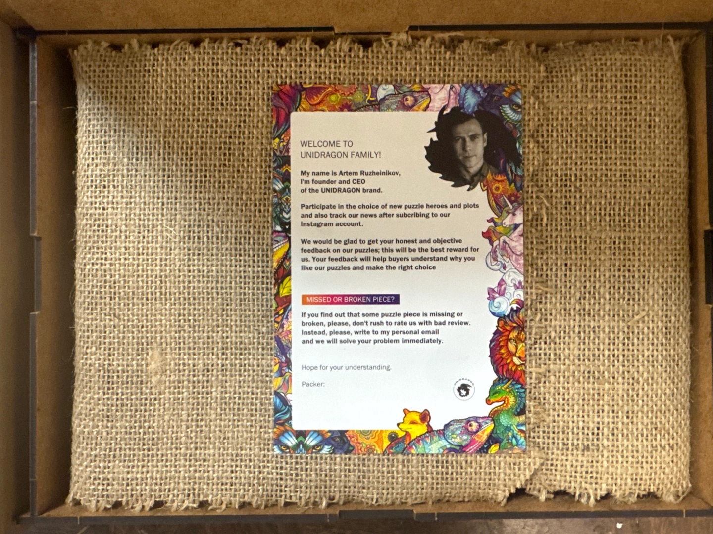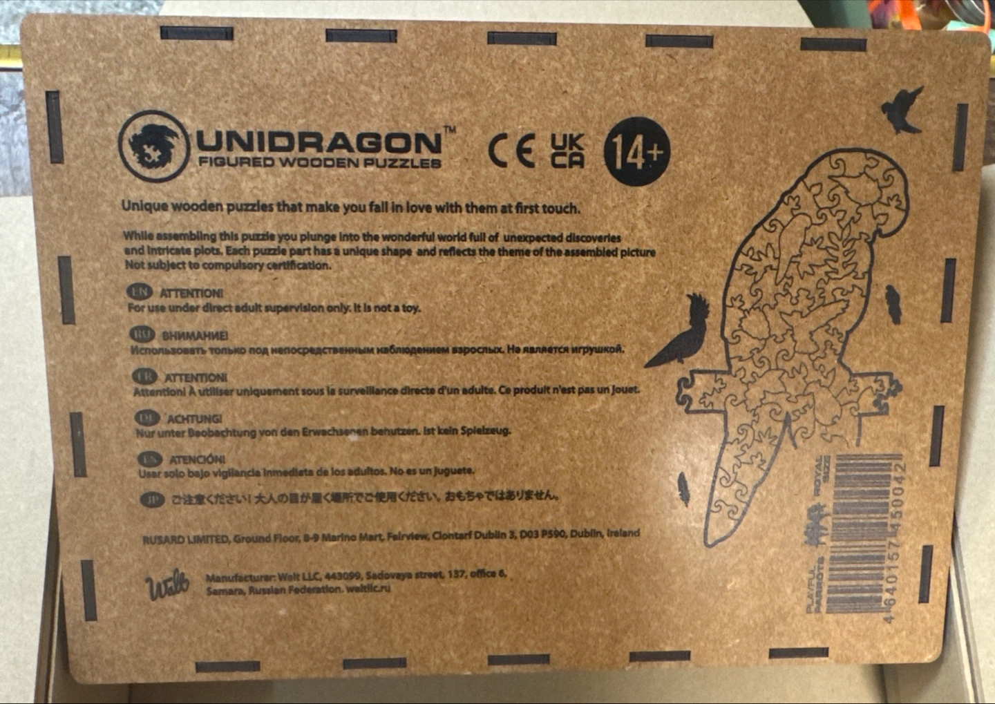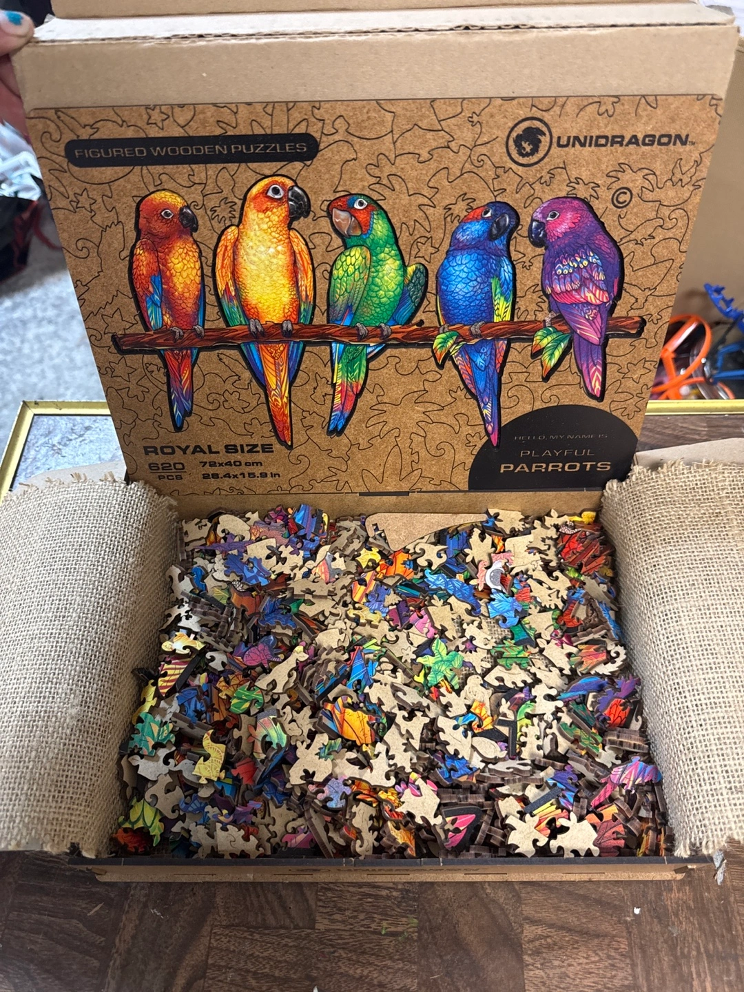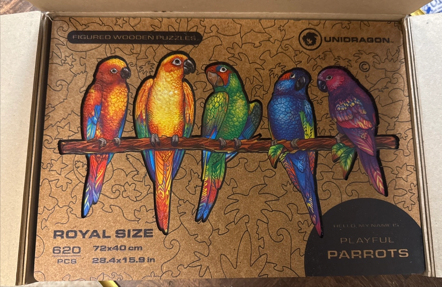 Unidragon wooden puzzle…it’s the Playful Parrots design! It's a royal size, measuring 72x40 cm (28.4x15.9 in). It is a 620 piece puzzle and it is in the original box.