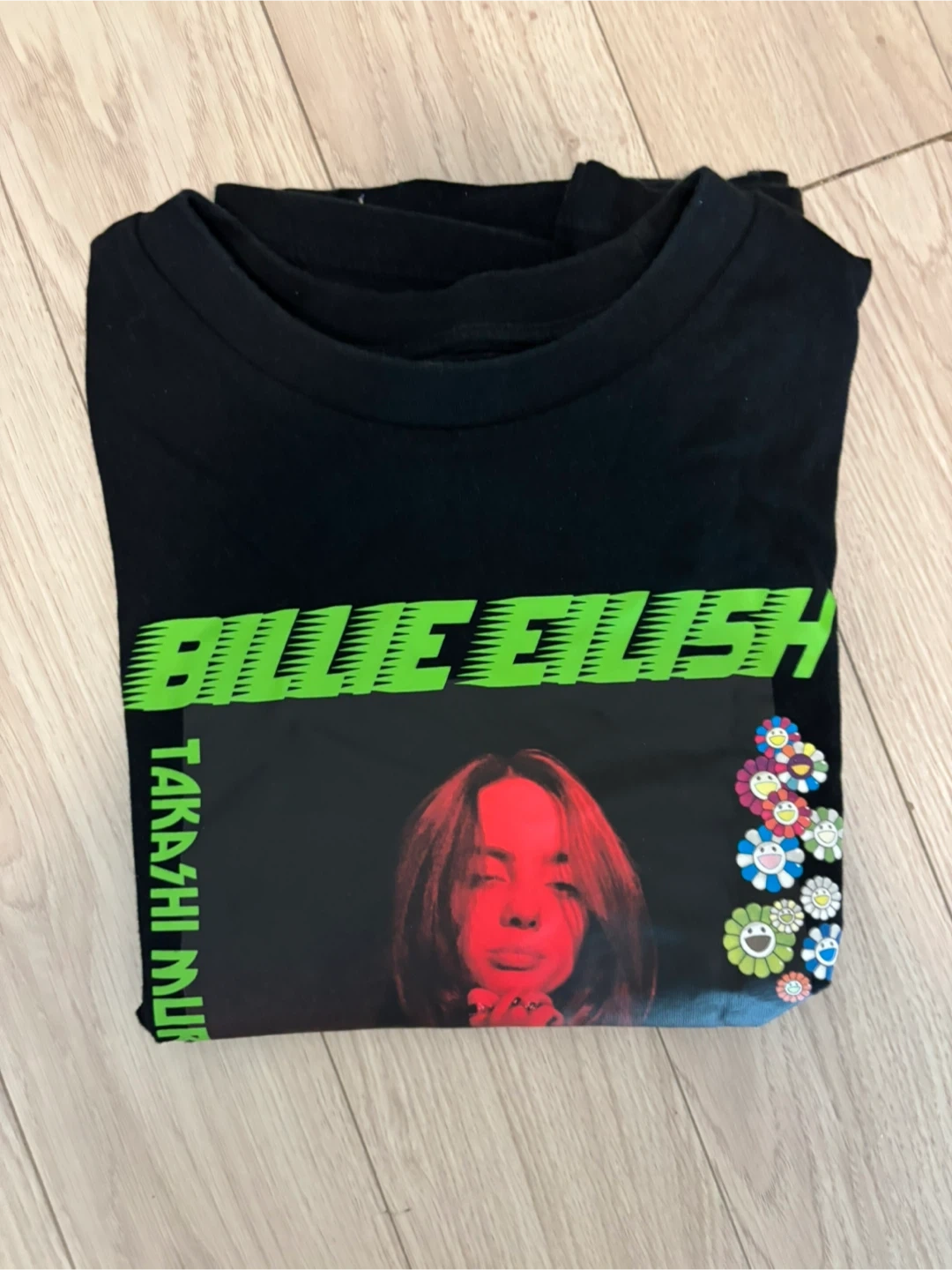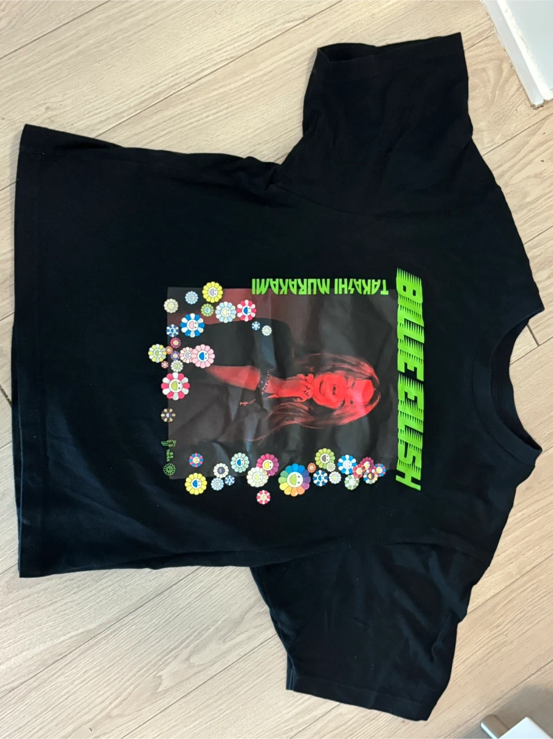 55Selling a black Uniqlo T-shirt from the Billie Eilish x Takashi Murakami collection. It's a roomy size XS. The shirt features Billie Eilish's image surrounded by Murakami's signature flower designs! It's in great condition.