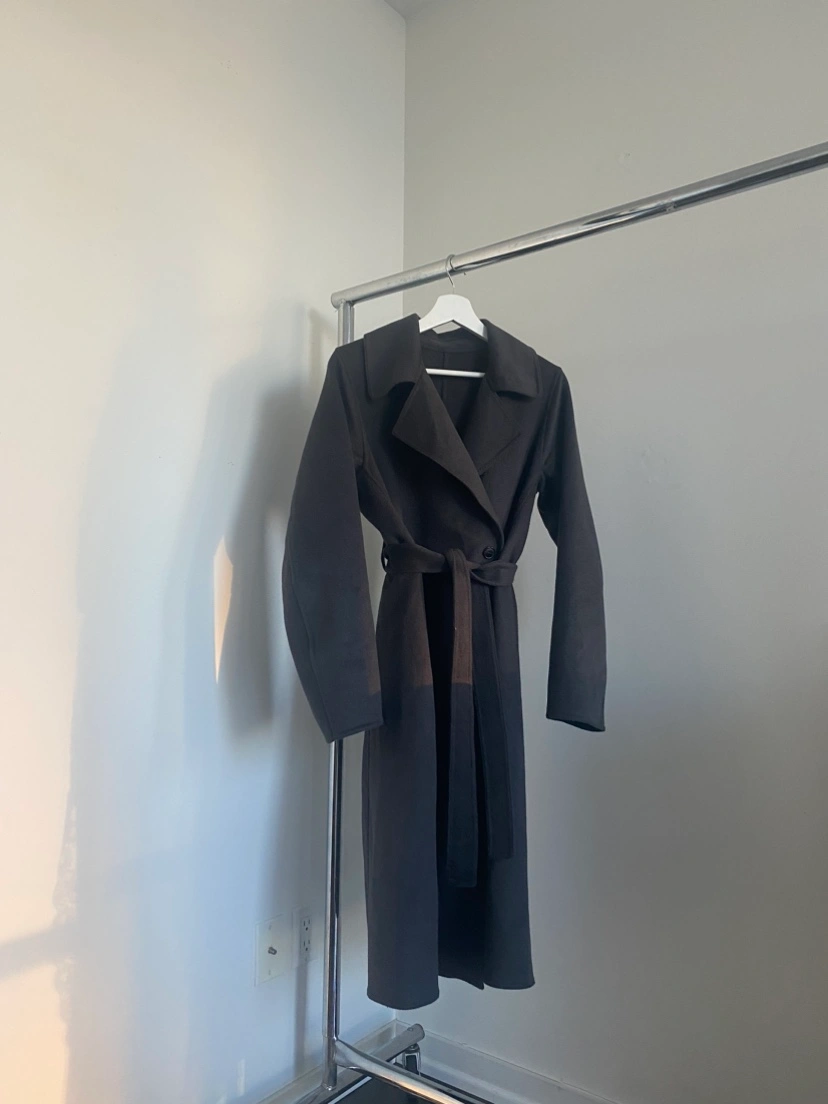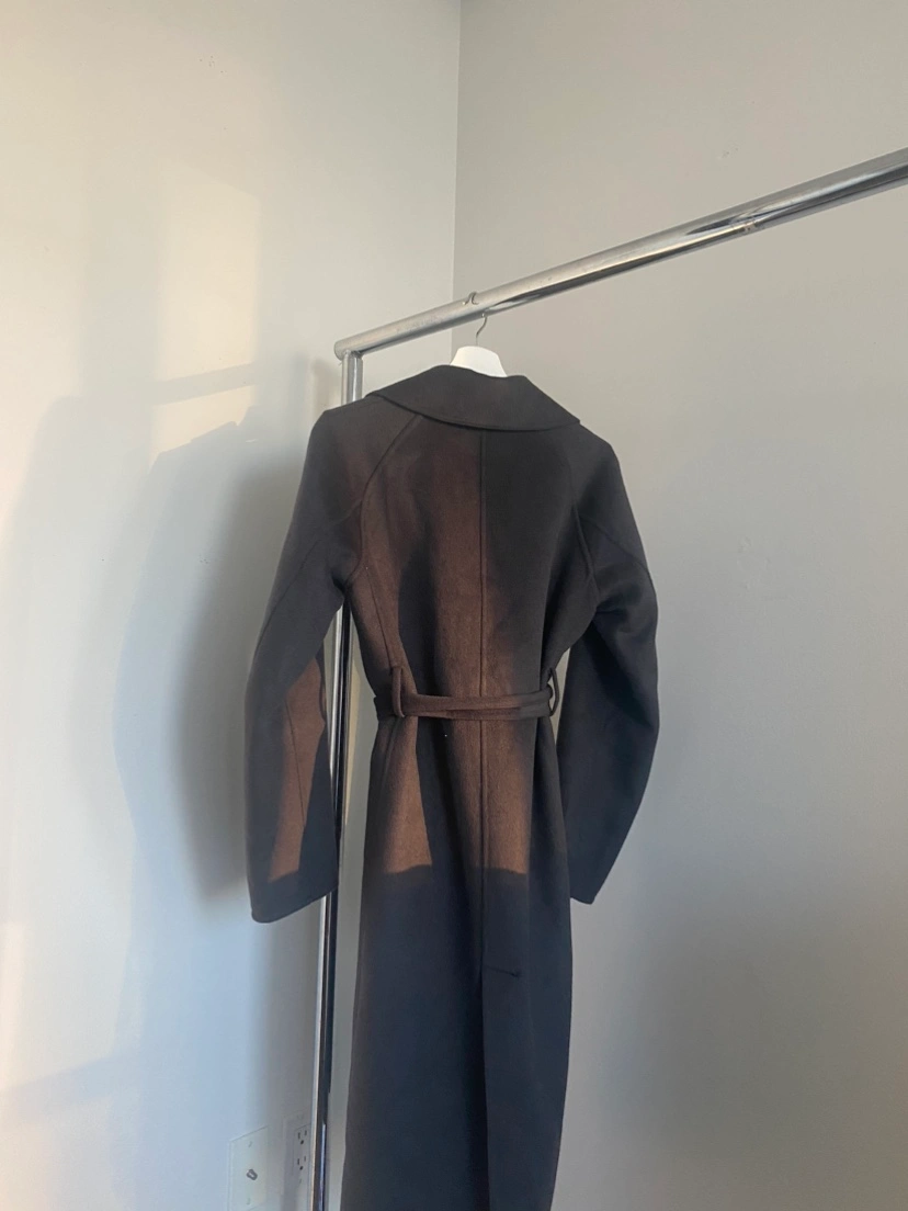 112Long charcoal grey coat with a tie belt. Made of wool blend. Has a single button closure and two side pockets. Measurements: Sleeves : 62cm Shoulder width: 40cm Full length: 110cm