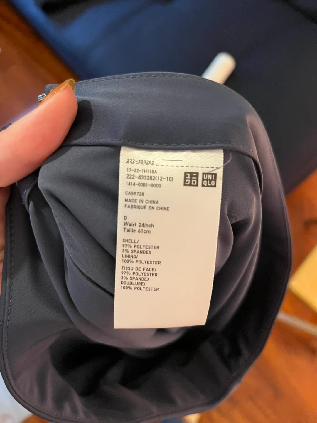 20Selling a Uniqlo skirt in dark blue. It's in great condition and ready for a new home! - Size: 0 (Waist 24 inches/ Taille 61cm) - Material: Shell - 97% Polyester, 3% Spandex; Lining - 100% Polyester