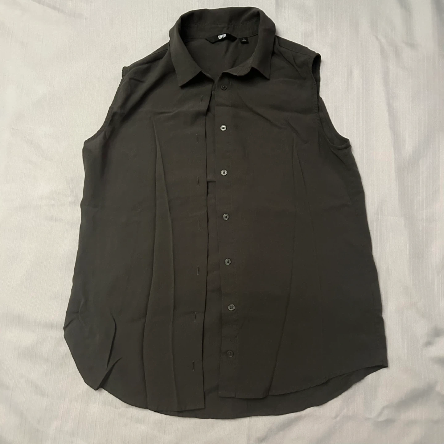 89Selling a Uniqlo sleeveless blouse in a dark olive colour! Perfect for layering or wearing on its own during warmer weather.